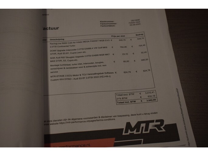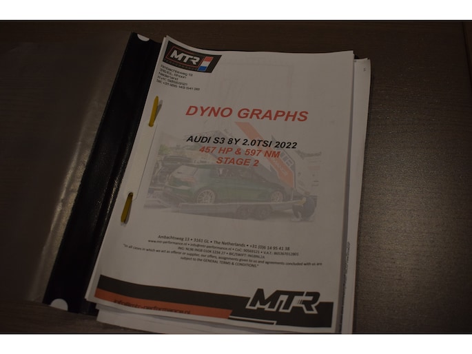 Audi S3 Sportback 2.0 TFSI Quattro. Unieke S3 welke door MTR Performance is voorzien van Stage 2 softwaretuning, RacingLine R600 Cold Air Intake, DO88 Upgrade intercooler t.w.v. € 3642,60. Deze aanpassingen zijn gedaan op 09-2025. Door deze aanpassingen heeft de S3 een vermogen van 457pk / 597NM. Documentatie en uitdraai testbank is aanwezig. Verder is de auto recent voorzien van groot onderhoud op 28-01-2026 bij 92.791km. De S3 is voorzien van mooie opties zoals Panoramadak, Virtual Cockpit, MMI Navigatiesysteem, B&O soundsysteem, Climate control, Stoelverwarming, Adaptieve Cruise Control, Half lederen interieur met elektrisch verstelbare voorstoelen, Multifunctioneel stuurwiel met afgevlakte onderzijde, Parkeersensoren voor en achter, Achteruitrijcamera, Buitenspiegels elektrisch verwarm- en inklapbaar, Elektrisch bedienbare kindersloten, Aluminium pedalen, Elektrisch bedienbare achterklep, LED koplampen en achterlichten, Sfeerverlichting interieur.