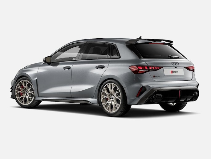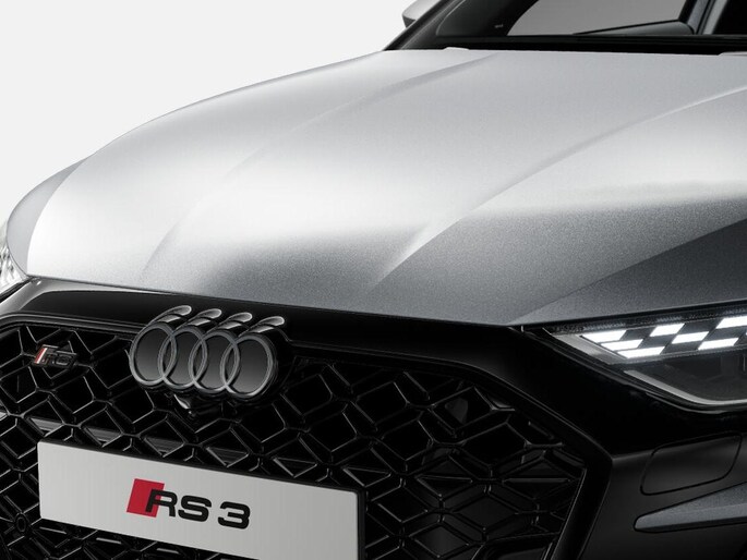 Uniek voor de RS3 competition limited zijn de twee nieuwe luchtgeleiders op beide voorhoeken, de verticale omlijstingen rond de air curtains, spiegelkappen, zijskirts alsmede de mat carbon afwerking boven de grote diffuser. In combinatie met de nu gesplitste voorspoiler onder de luchtinlaten oogt de RS 3 competition limited nu nog breder. Indrukwekkende 19 inch kruisspaaksvelgen in mat Neodymiumgoud maken het sportieve uiterlijk van het model compleet. De donkergetinte matrix LED-koplampen zijn eveneens exclusief voorbehouden aan deze special edition. Bij het vergrendelen of ontgrendelen van de auto lichten hun segmenten op in een 1-2-4-5-3 patroon - een knipoog naar de ontstekingsvolgorde van de vijfcilindermotor.