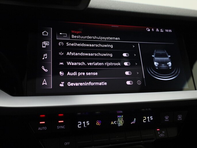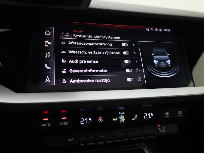 Geavanceerde veiligheidssystemen kijken tijdens elke rit met u mee en schatten continu de risico's in. De actuele snelheidslimiet, een inhaalverbod en andere verkeersborden; de verkeersborddetectie ondersteunt u tijdens elke rit. Het Lane-keeping systeem let constant op en waarschuwt of corrigeert als u onoplettend over de lijnen van de rijstrook gaat. Deze Audi A3 Sportback is voorzien van Brake Assist, die extra remkracht geeft bij een noodstop. Ook helpen het hill hold functie en bandenspanningcontrolesysteem, uw rit tot een veilige rit te maken.