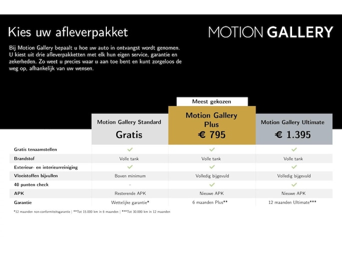 Dit afleverpakket bevat (in plaats van afleverpakket "Motion Gallery Standard"): 12 maanden Ultimate-garantie (tot 30.000 km), 40-punten technische controle, Gratis tenaamstelling, Nieuwe APK, Vloeistoffen volledig bijgevuld, Volledige exterieur- en interieurreiniging, Volle tank brandstof