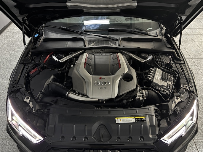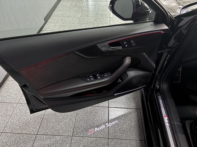 Uitgevoerd in de kleur Mythos Black Metallic met zwart lederen interieur met rode stiksels in honingraatpatroon een Audi zoals hij moet zijn.
