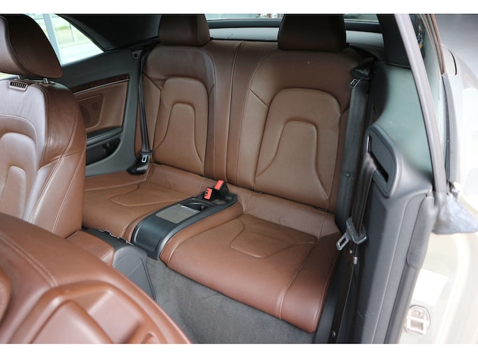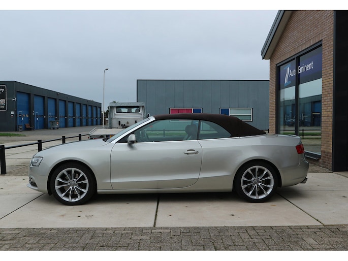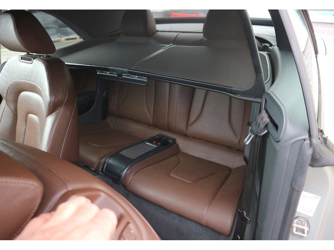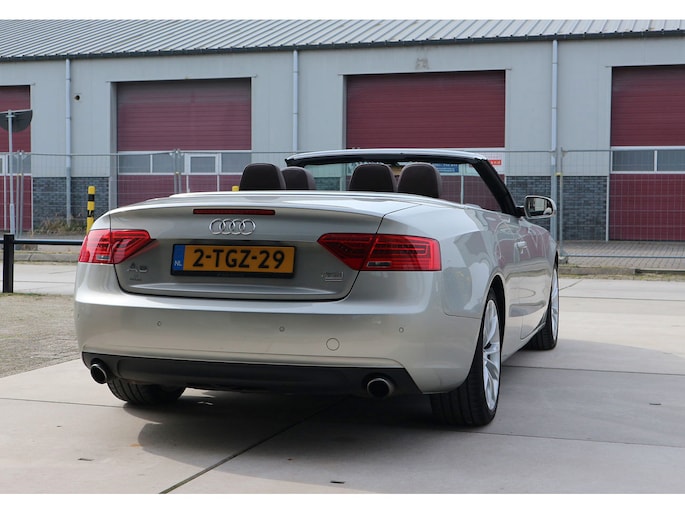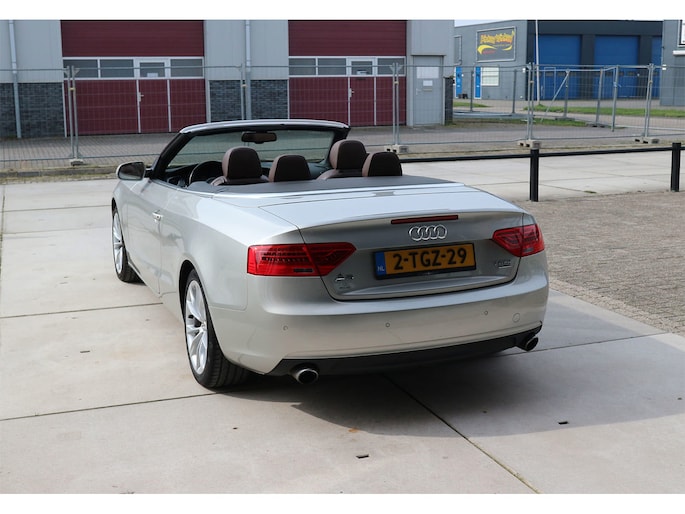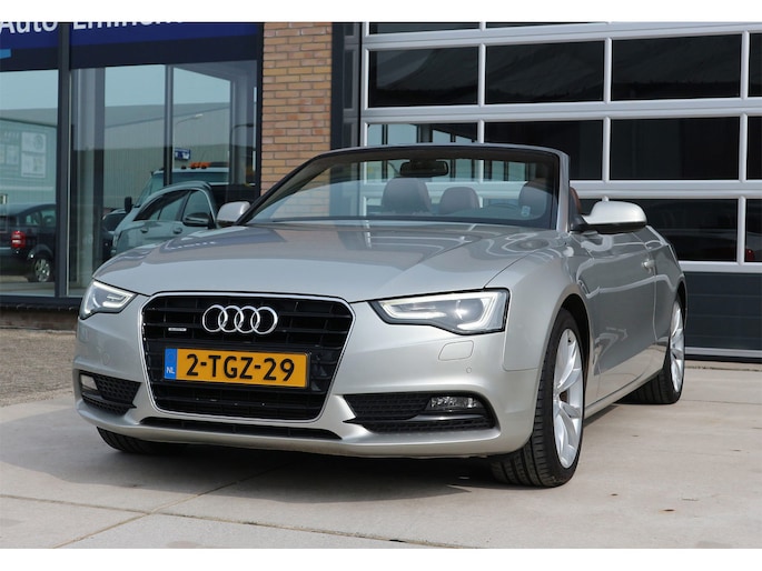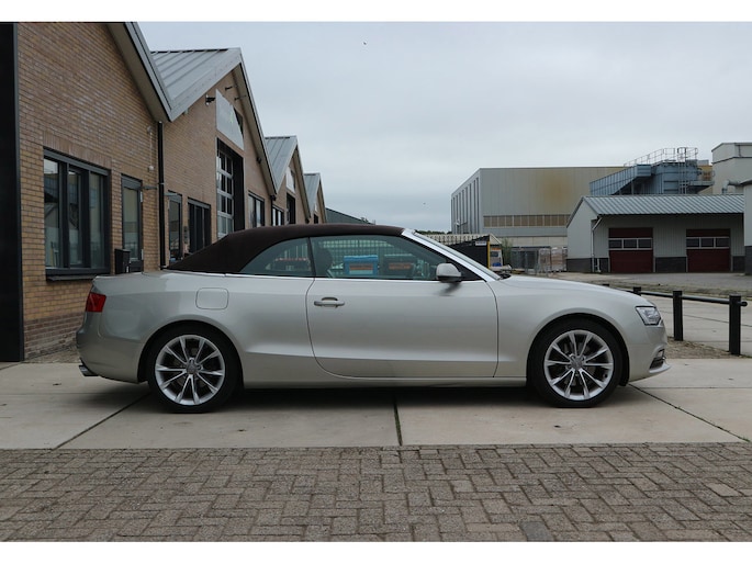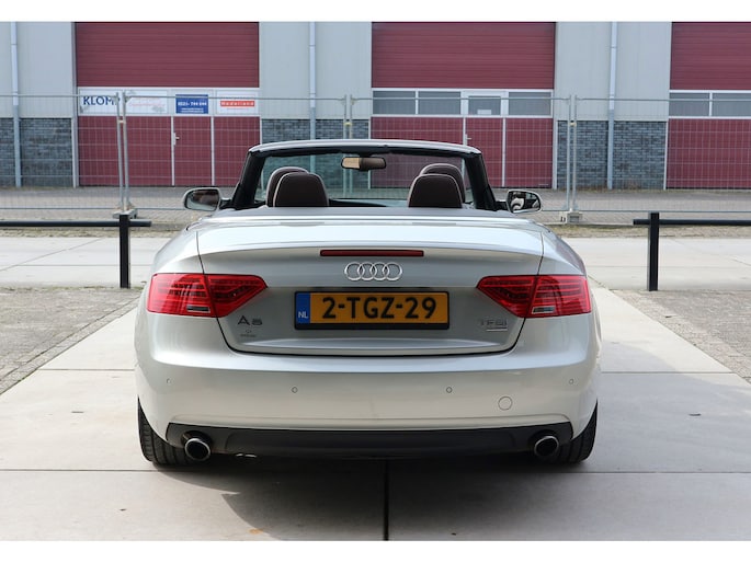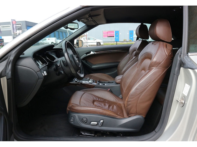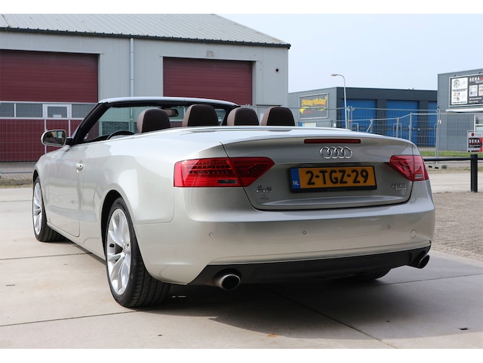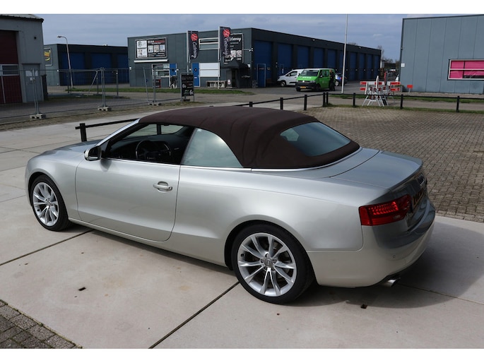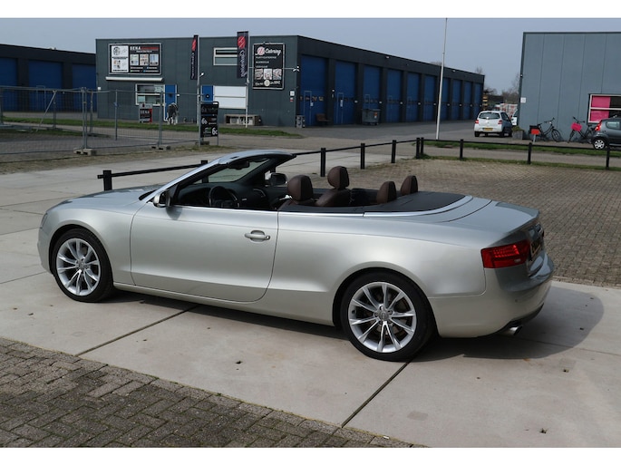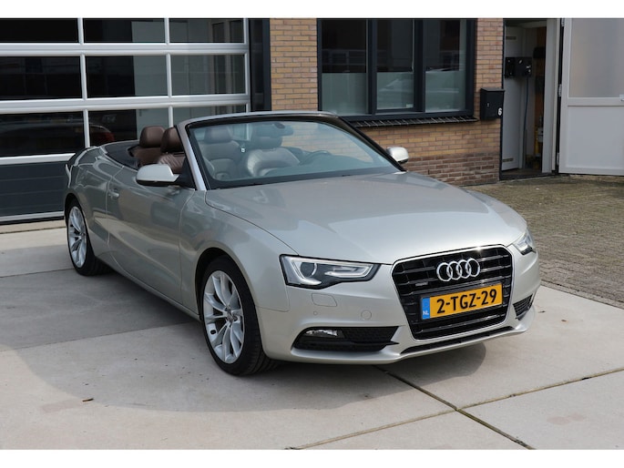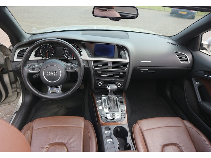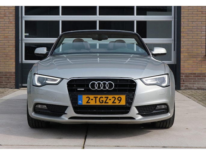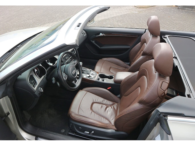 Schitterende Audi A5 2.0 TFSI quattro cabriolet van 2014, ‘1A’-auto in zeldzame uitvoering Cuvée-zilver metallic exterieur met kastanjebruin vol leder interieur en passend bruine cabrioletkap, 2 liter TFSI 211 pk met S-tronic automaat èn quattro vierwielaandrijving, en heel veel opties; vol leder bekleding, comfortstoelen, nekverwarming, stoelverwarming en koeling, achterbankverwarming, elektrisch verstelbare stoelen met geheugenstanden, keyless entry en start, climate control, cruise control, MMI plus navigatie, Audi DSP audiosysteem, bi-xenon verlichting, LED dagrijverlichting en bochtverlichting,18 inch lichtmetaal velgen, PDC voor en achter optisch en akoestisch, servotronic en een afneembare trekhaak.