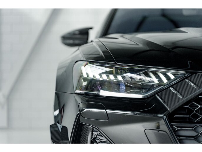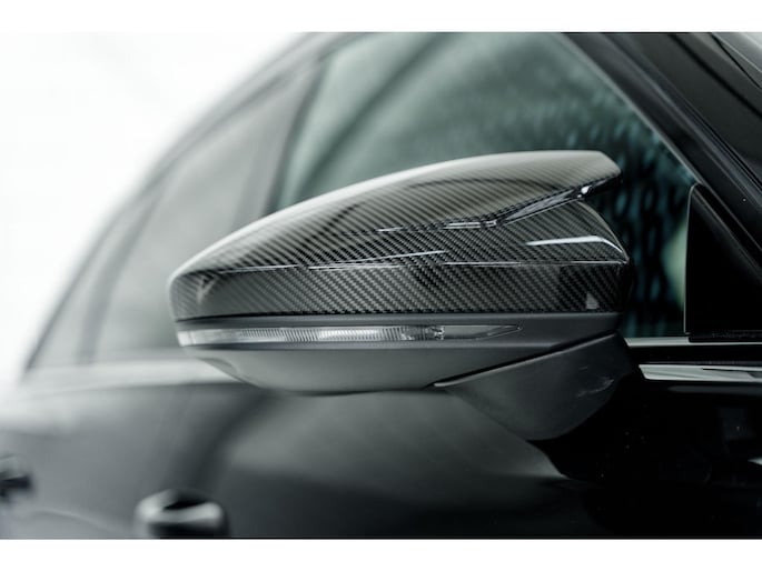Het exterieur wordt gedomineerd door het uitgebreide ABT aerodynamica pakket in hoogglans zichtcarbon. Elk detail is zorgvuldig ontworpen en uitgevoerd: van de agressieve frontlip en frontblades tot de carbon spiegelkappen, side skirts en de indrukwekkende achterzijde met diffuser en spoiler. Alles draagt bij aan zowel de uitstraling als de aerodynamische prestaties van de auto.