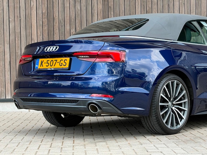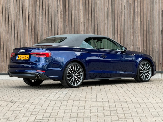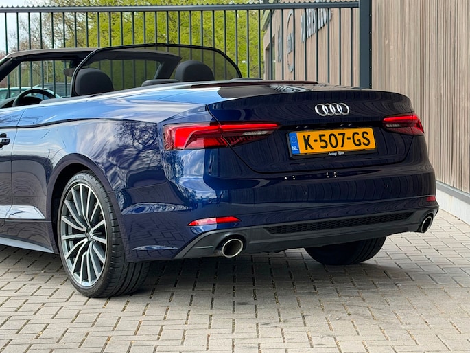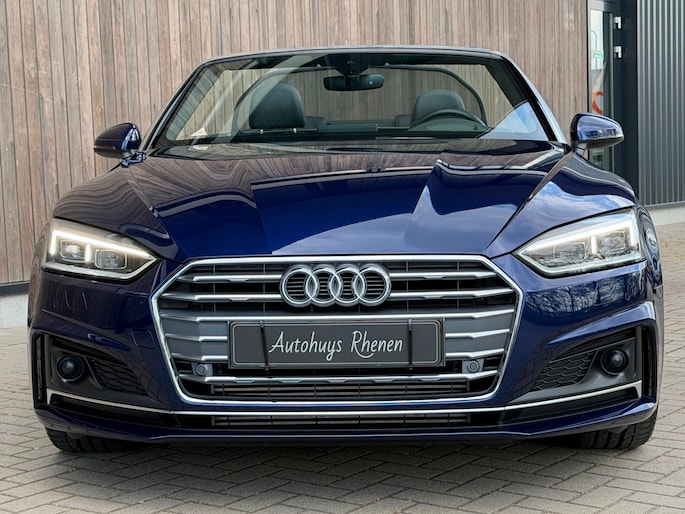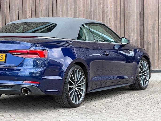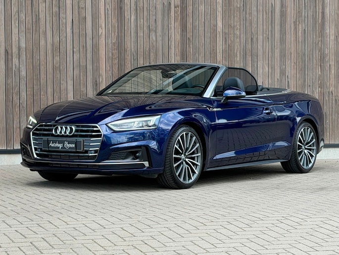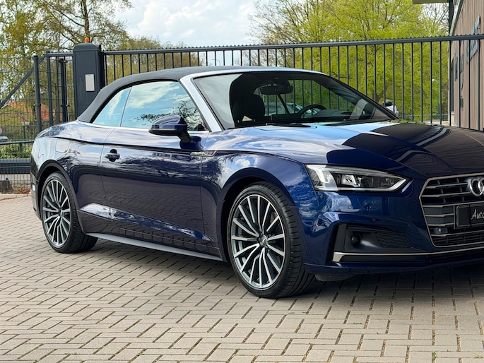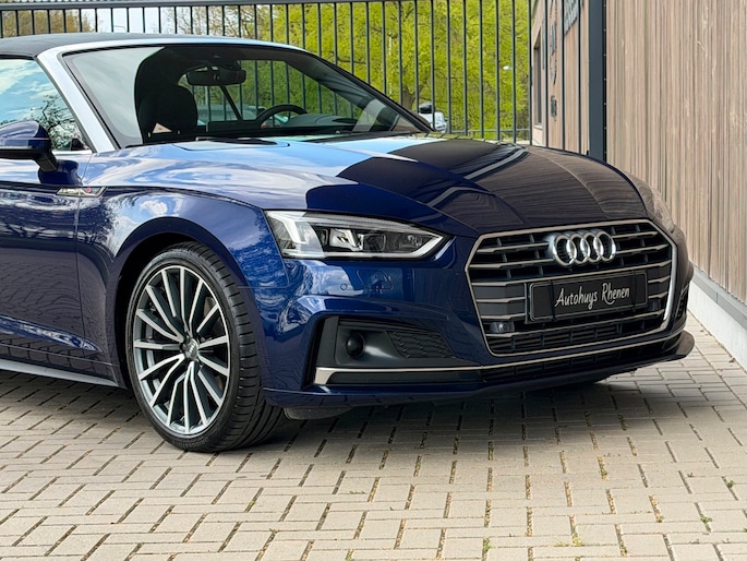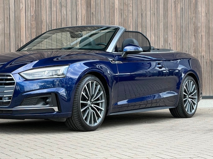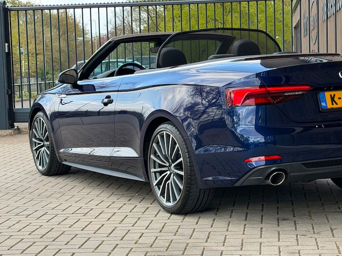 TE KOOP AANGEBODEN: Schitterende en in zeer nette staat verkerende Audi A5 Cabriolet 40 TFSI Design S-line Automaat uit 2019 in de kleur Navarra blue metallic. De auto staat op dit moment op 4 prachtige 19 inch licht metalen wielen met goede banden, is altijd keurig onderhouden geweest wat wel tot uiting komt zowel aan de binnen als aan de buitenkant van de auto. Ook is de auto voorzien van o.a automatische airco, adaptive cruise control, elektrisch pakket, multifunctioneel lederen stuur, luxe S-LINE bekleding, groot full-map navigatiesysteem, parkeersensoren voor en achter, matrix/Led verlichting voor en achter, achteruitrijcamera, elektrische stoelen met massagefunctie, headup display, stuurwielverwarming, dodehoek detectie etc.etc.. Ook zijn er 2 sleutels aanwezig met afstandsbediening. Tevens is de auto APK goedgekeurd tot 11-04-2028