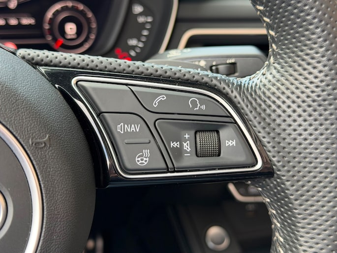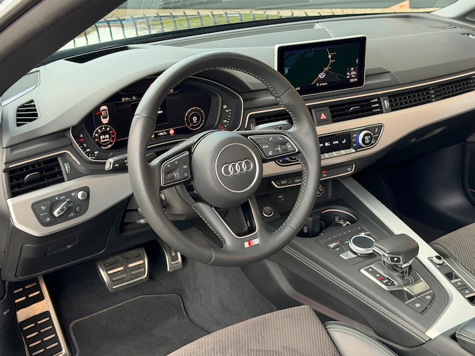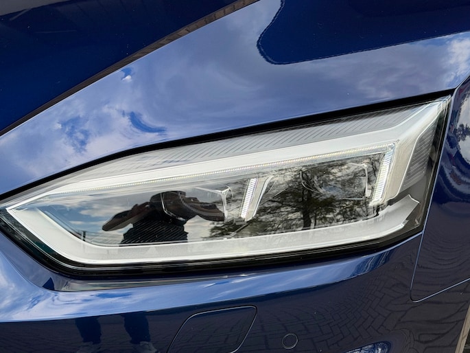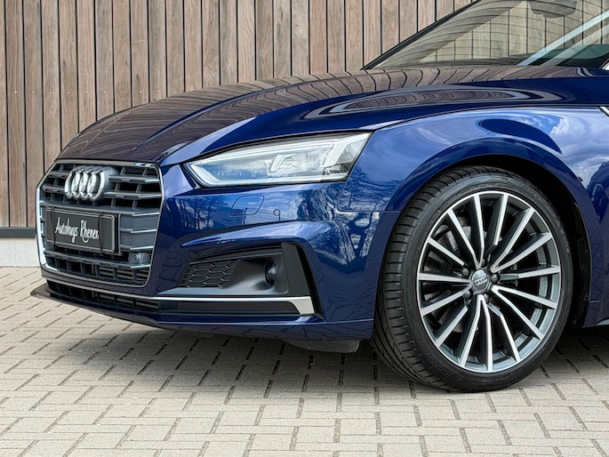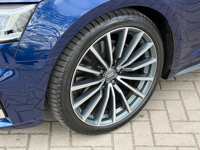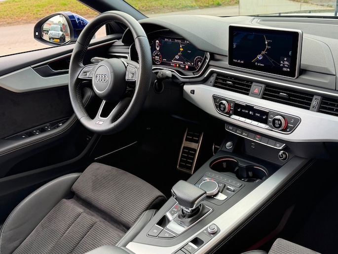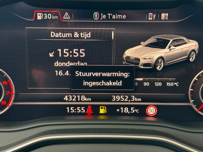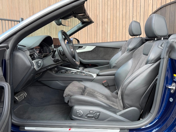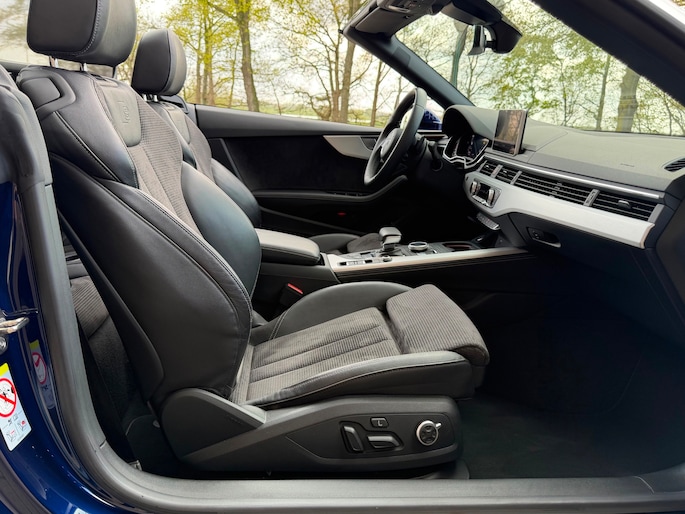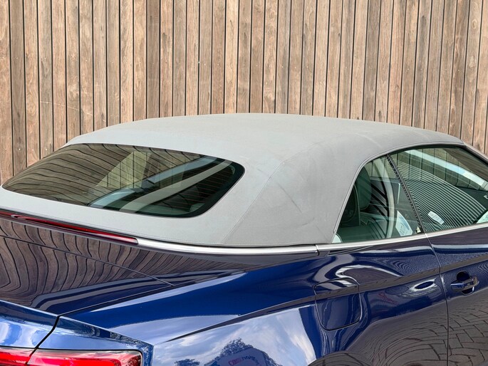 TE KOOP AANGEBODEN: Schitterende en in zeer nette staat verkerende Audi A5 Cabriolet 40 TFSI Design S-line Automaat uit 2019 in de kleur Navarra blue metallic. De auto staat op dit moment op 4 prachtige 19 inch licht metalen wielen met goede banden, is altijd keurig onderhouden geweest wat wel tot uiting komt zowel aan de binnen als aan de buitenkant van de auto. Ook is de auto voorzien van o.a automatische airco, adaptive cruise control, elektrisch pakket, multifunctioneel lederen stuur, luxe S-LINE bekleding, groot full-map navigatiesysteem, parkeersensoren voor en achter, matrix/Led verlichting voor en achter, achteruitrijcamera, elektrische stoelen met massagefunctie, headup display, stuurwielverwarming, dodehoek detectie etc.etc.. Ook zijn er 2 sleutels aanwezig met afstandsbediening. Tevens is de auto APK goedgekeurd tot 11-04-2028