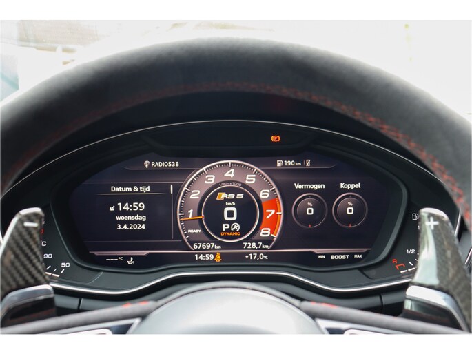 Autobedrijf John van der Rijt biedt u aan deze fantastische en super complete 535pk sterke Audi RS5 2.9 V6T Quattro uit 2017, 89dkm ervaring. Deze auto is o.a. voorzien van: Panorama dak, Lane assist en file-ondersteuning, Bang & Olufsen, Camera , Head-up Display, Matrix Laser LED Koplampen, DAB Radio, Keyless Entry & Go, Elektr. verstelbare RS Super-Sportstoelen met nappa leder en rode stiksels incl. memory en verwarming voorstoelen en achterbank, Deze RS5 is voorzien van exclusieve Vossen wielen en van de standaard 450pk professioneel en op de dyno naar 535pk gebracht door de vorige eigenaar (Echte liefhebber die nergens op bezuinigd) deze RS5 is tevens voorzien van een in hoogte verstelbaar KW onderstel.