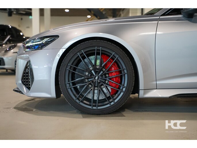 Audi RS6 4.0 V8 TFSI in de kleur Florett Zilver, met ABT velgen en zwart lederen interieur met rood stiksel.