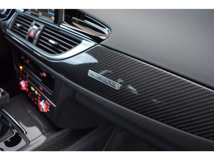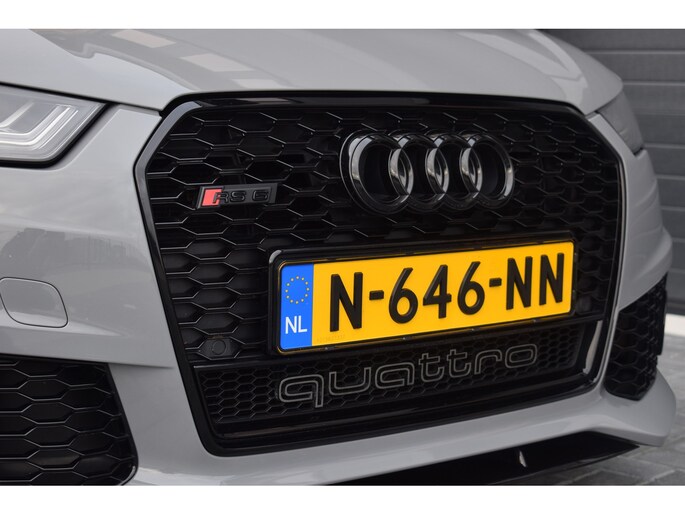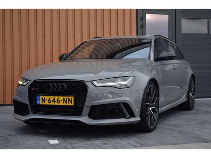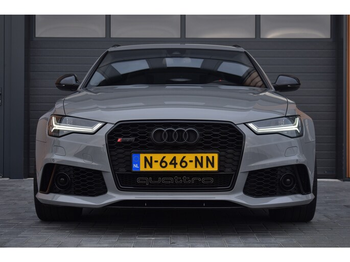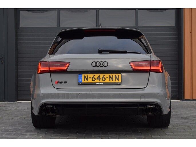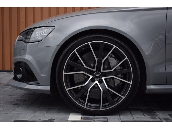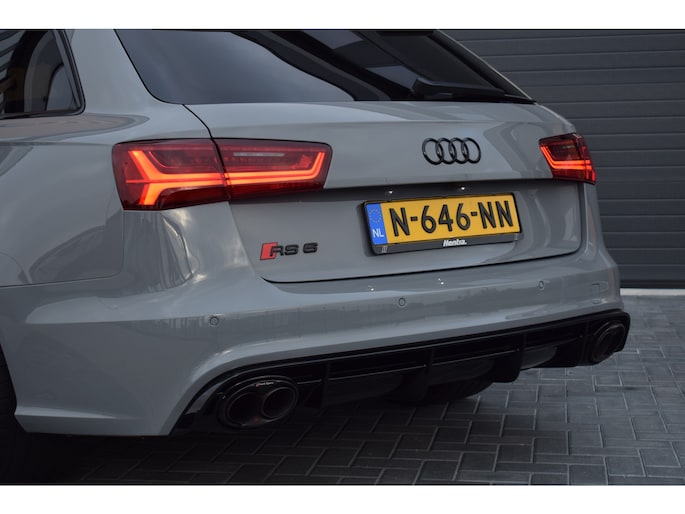 Audi RS6 Avant 4.0 V8 TFSI Quattro 605pk Performance. Uitgevoerd met o.a.: Akrapovič uitlaatsysteem (origineel af fabriek), Dynamic Plus pakket, Keramische remschijven, Zwart glanzend optiekpakket incl. 'Quattro' opschrift in inlaattrechter, Geluidsisolerend glas, Matrix LED koplampen, Lichtmetalen velgen 21", Sportonderstel met variabele demping, Lederen sportstuur met afgevlakte onderzijde, Half lederen / alcantara interieur, Elektrisch verstelbare sportstoelen met geheugenfunctie in bestuurdersstoel, Stoelpanelen met leer bekleed (Audi Exclusive), Alcantara hemelbekleding, Stoelverwarming voor + achter, Keyless entry, Elektrisch bedienbare achterklep, MMI High navigatiesysteem, BOSE soundsysteem, Digitale radio ontvangst, Parkeersensoren voor en achter, Achteruitrijcamera, Adaptieve Climate control, Cruise control, Lane Assist, Side Assist.