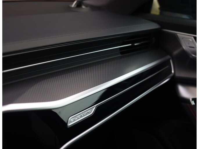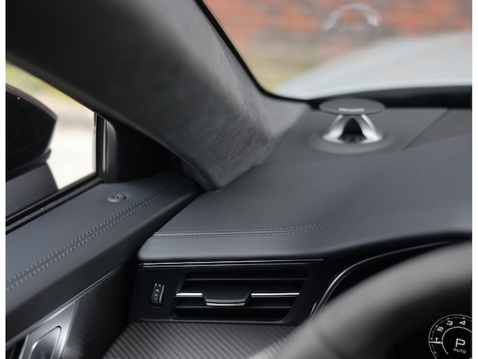 In het interieur vinden we zwart lederen sportstoelen, volledig naar wens instelbaar en voorzien van verwarming en ventilatie. Ook de achterpassagiers genieten van optimaal comfort dankzij de 4-zone klimaatregeling en verwarmbare achterstoelen. Om het geheel af te werken zijn de interieurlijsten uitgevoerd in Aluminium en zijn alle details bekleed met zwart Alcantara. Het grote panoramadak brengt extra licht in het interieur en zorgt voor een ruimtelijker gevoel.