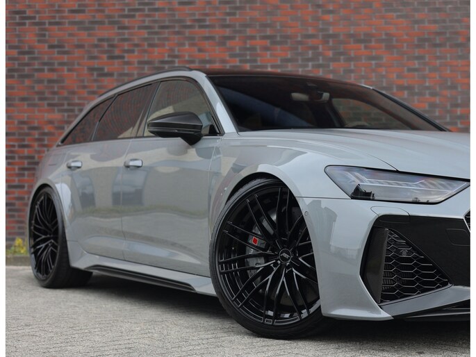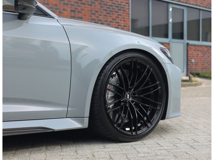 Naast het Nardo Gray lakwerk, wat de auto een erg stoere uitstraling geeft, vallen er nog twee zaken op. De voorbumper is zodanig aangepast met een zwarte wrap dat deze lijkt op die van de befaamde RS6 GT, een smaakvolle aanpassing die de auto nóg bruter maakt! Daarnaast staat de auto op prachtige hoogglans zwarte ABT velgen, samen met de keramische remmen zorgt dit ervoor dat het totaalplaatje er absoluut mag wezen.