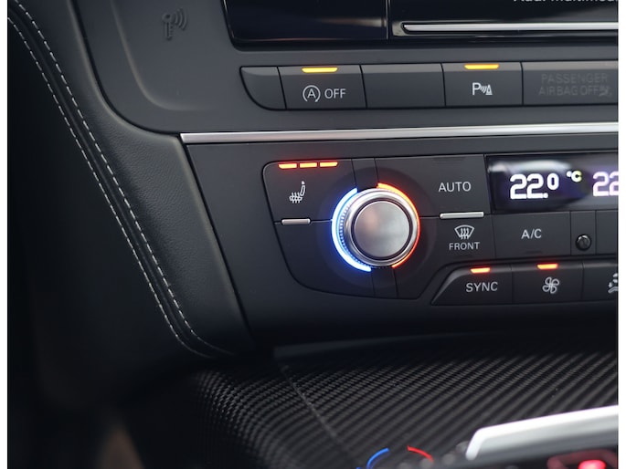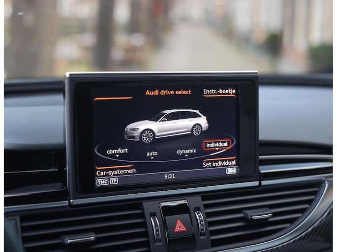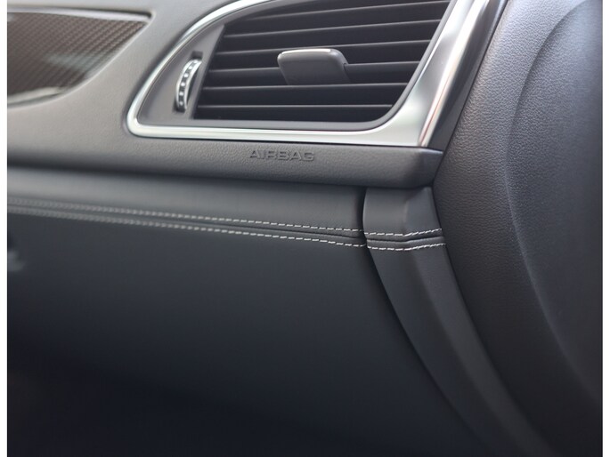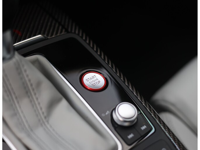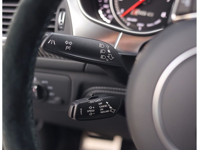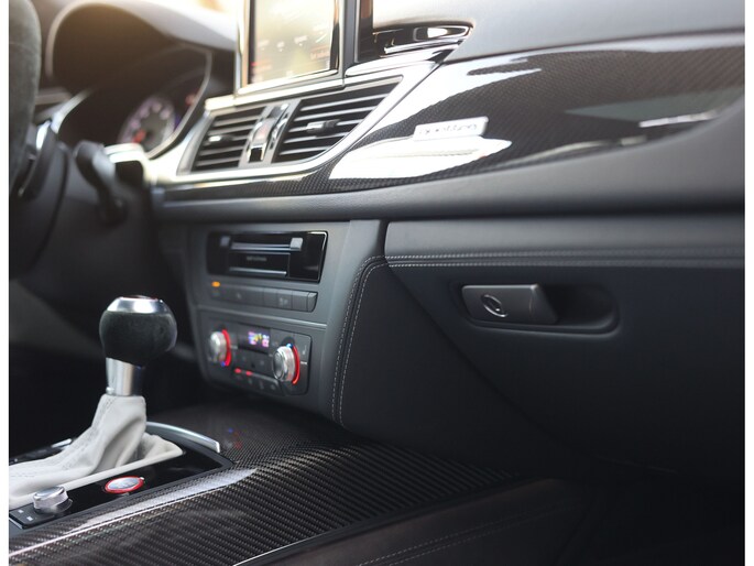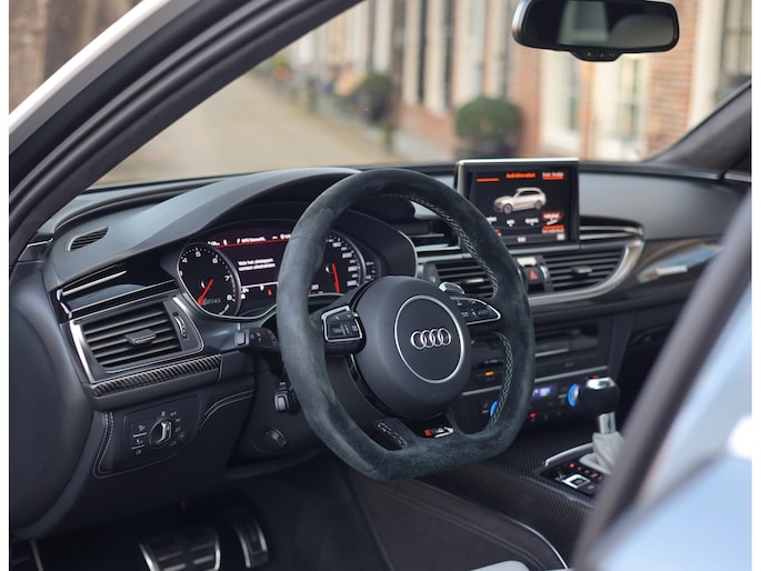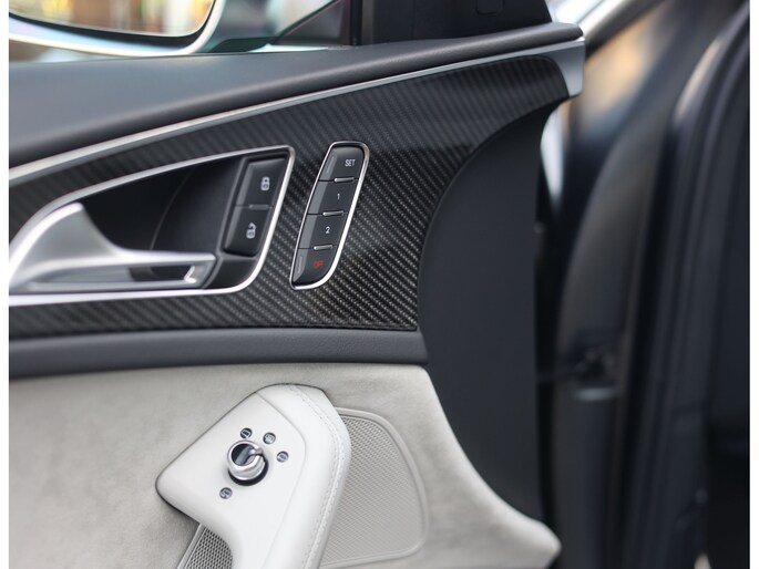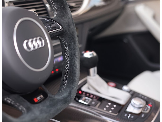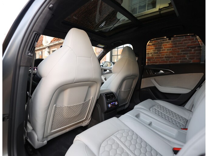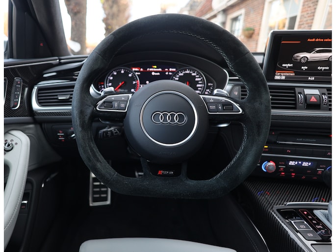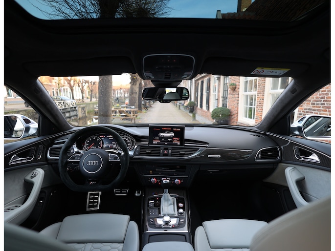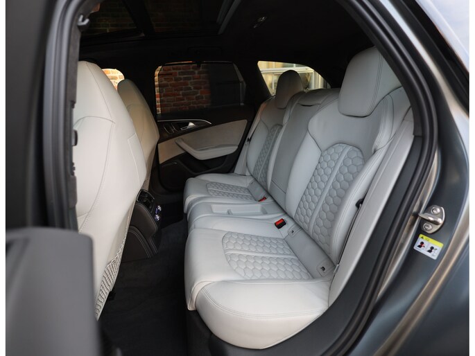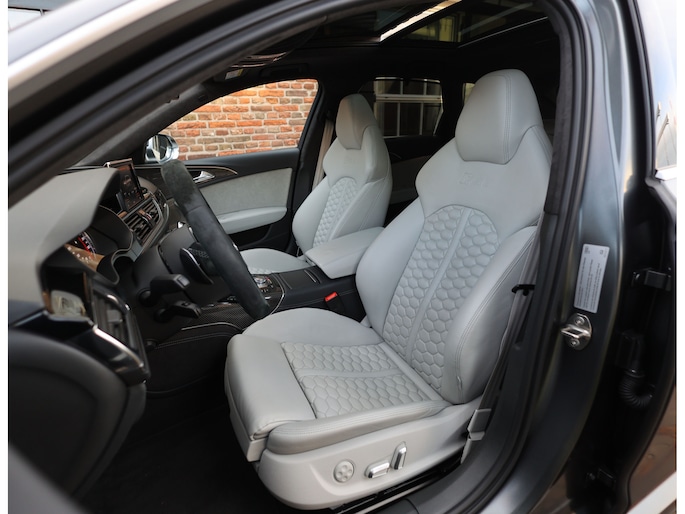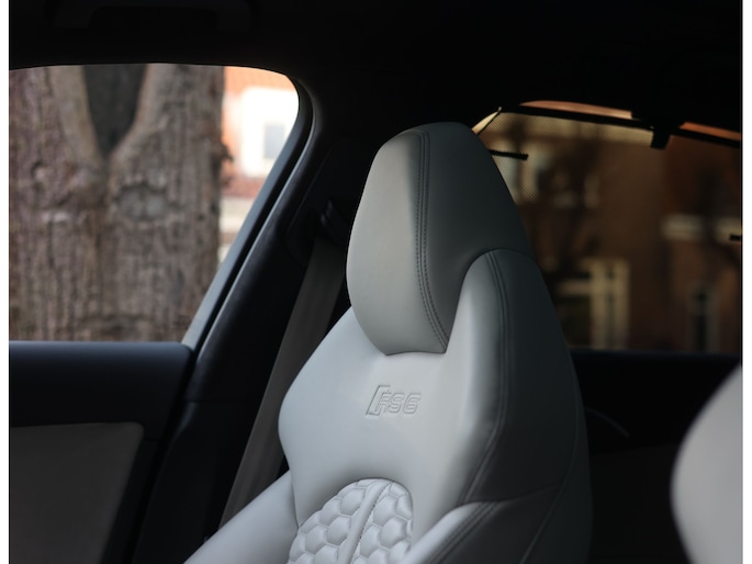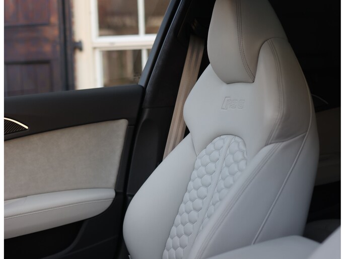 Binnenin gaat het feest verder, want wát een geweldige samenstelling is dit! De sportstoelen zijn bekleed met Moon Silver Valcona leder, voorzien van diamantstiksels en RS-logo’s. Ook hier is de auto tot in detail perfect samengesteld. Carbon interieurlijsten, een suède stuurwiel, Moon Silver leder om de automaatpook… Zelfs de Alcantara binnenhemel en de volledig lederen middentunnel zijn voorzien van contrasterende stiksels! 100 procent perfectie bestaat niet, maar deze RS6 komt extreem dicht in de buurt!