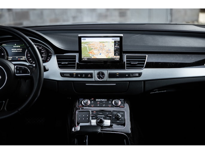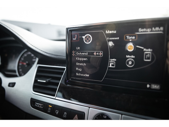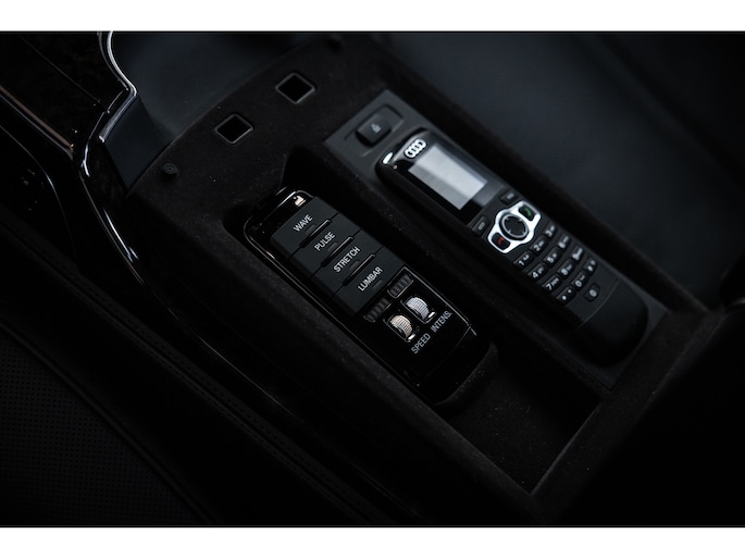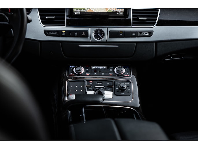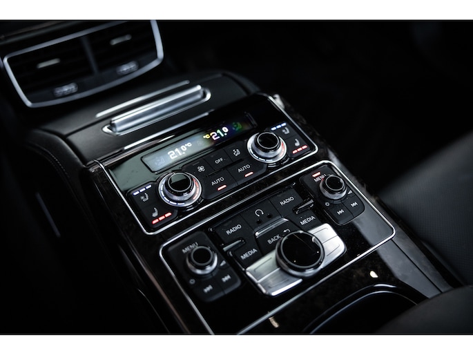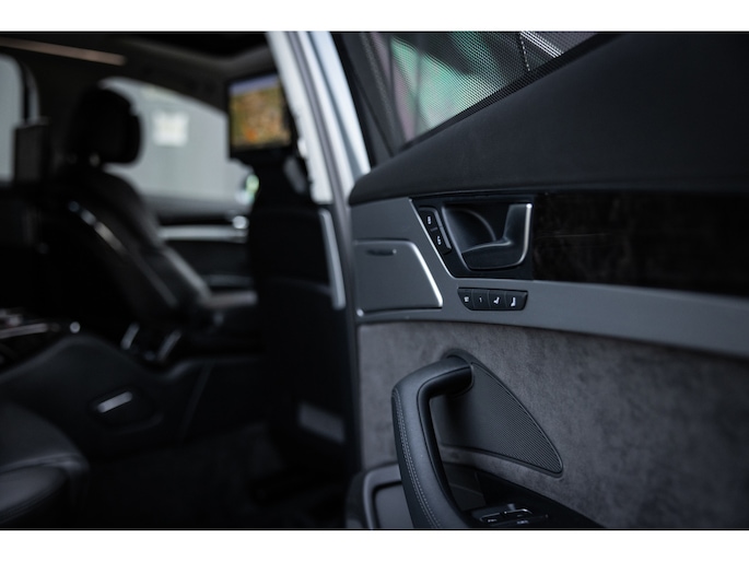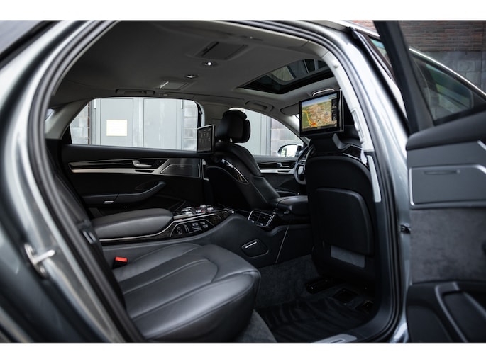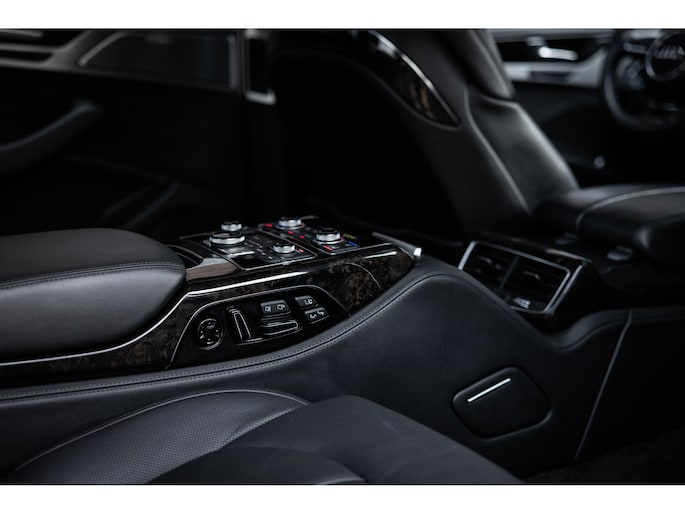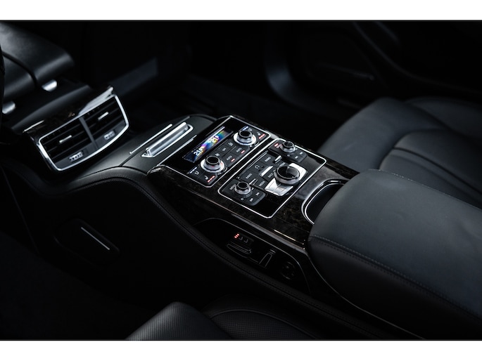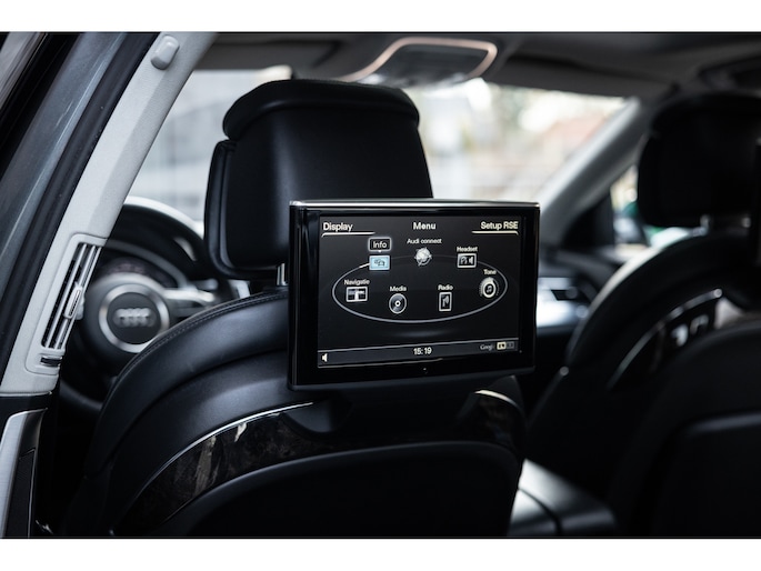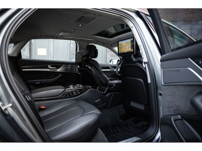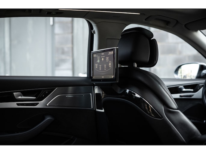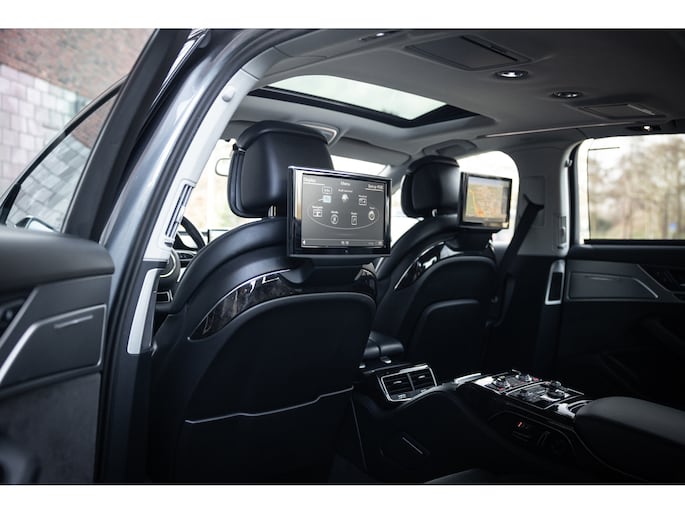 Meest in het oog springend is uiteraard het feit dat dit een A8 met verlengde wielbasis is – de zogenaamde ‘Lang’. De extra ruimte komt volledig voor de achter passagiers. Specifiek deze A8 is voorzien van de enkele stoel opstelling. Een unieke optie waarbij er slechts twee zitplekken achter zijn met een ultra luxe middenconsole en alle opties die je kunt wensen. Zo beschik je als passagier op één van deze zetels over volledig elektrisch bediende stoelverstelling, inclusief memorystanden, stoelverwarming, stoelventilatie en zelfs massage met verschillende programma’s. Vanaf de middenconsole of met de afstandsbediening bedien je het rear seat entertainment. De twee grote schermen tonen alle functies die voorin ook mogelijk zijn met als extra de mogelijkheid tot het kijken van video’s. Tevens voorziet de middenconsole van een opklaptafel en is er geopteerd voor maximale afwerking in leder en luxe hoogglans sierlijsten. Echt op het hoogste niveau.