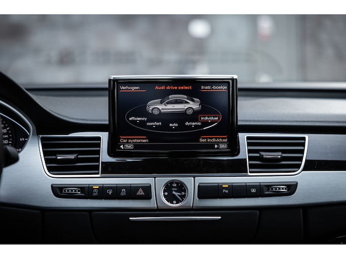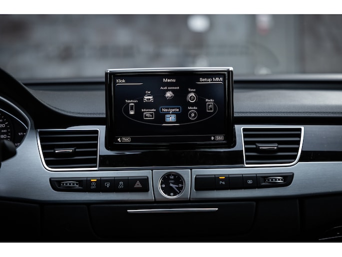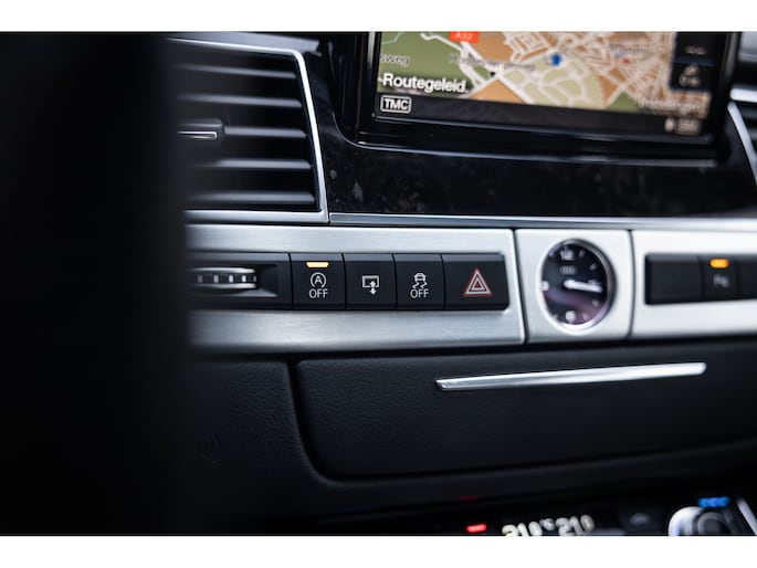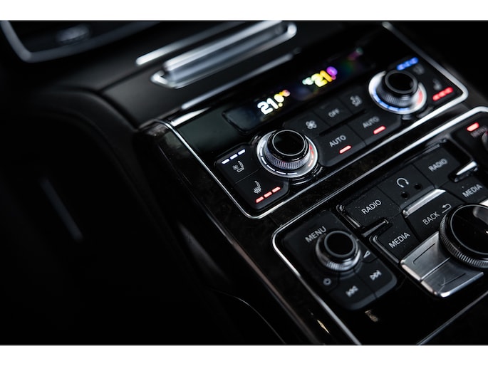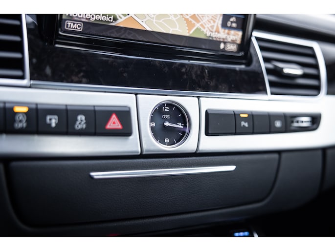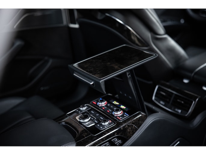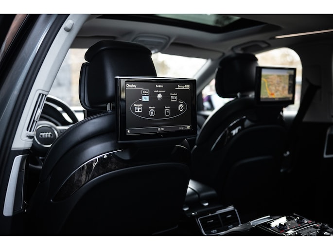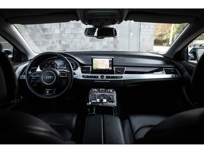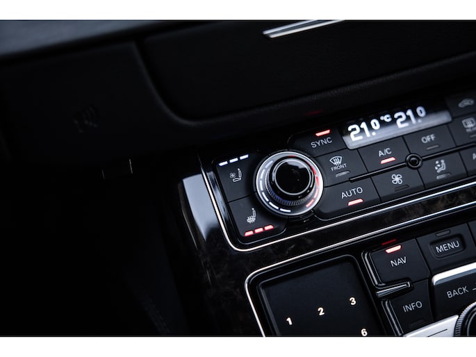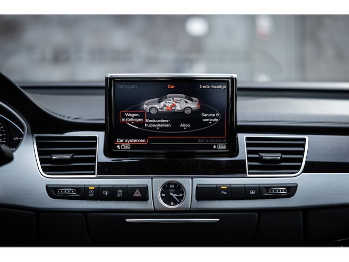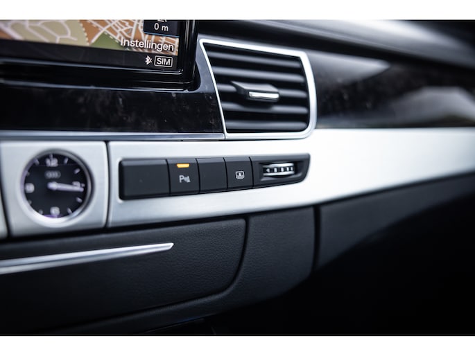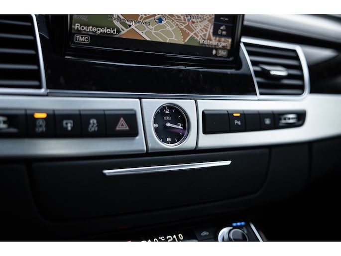 Meest in het oog springend is uiteraard het feit dat dit een A8 met verlengde wielbasis is – de zogenaamde ‘Lang’. De extra ruimte komt volledig voor de achter passagiers. Specifiek deze A8 is voorzien van de enkele stoel opstelling. Een unieke optie waarbij er slechts twee zitplekken achter zijn met een ultra luxe middenconsole en alle opties die je kunt wensen. Zo beschik je als passagier op één van deze zetels over volledig elektrisch bediende stoelverstelling, inclusief memorystanden, stoelverwarming, stoelventilatie en zelfs massage met verschillende programma’s. Vanaf de middenconsole of met de afstandsbediening bedien je het rear seat entertainment. De twee grote schermen tonen alle functies die voorin ook mogelijk zijn met als extra de mogelijkheid tot het kijken van video’s. Tevens voorziet de middenconsole van een opklaptafel en is er geopteerd voor maximale afwerking in leder en luxe hoogglans sierlijsten. Echt op het hoogste niveau.
