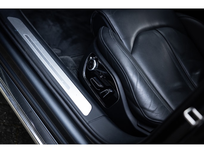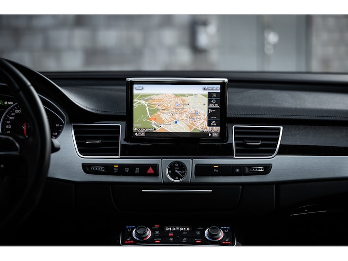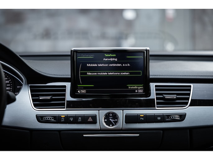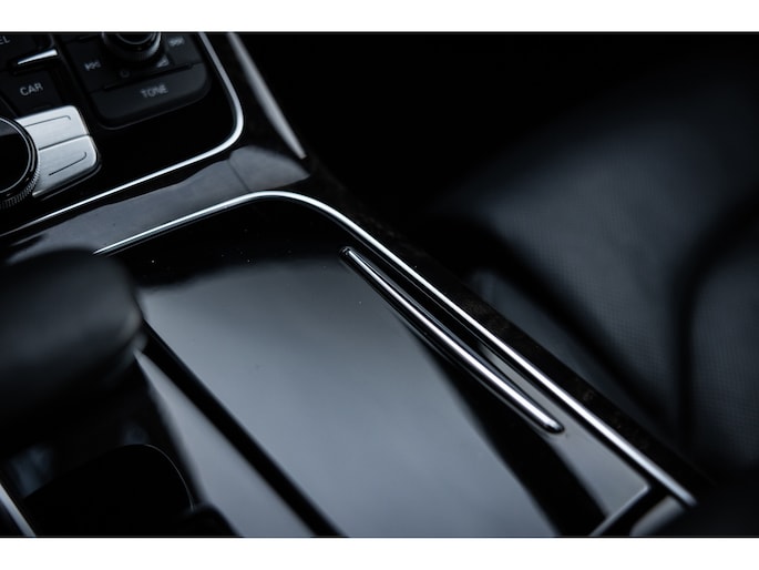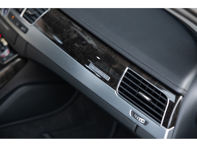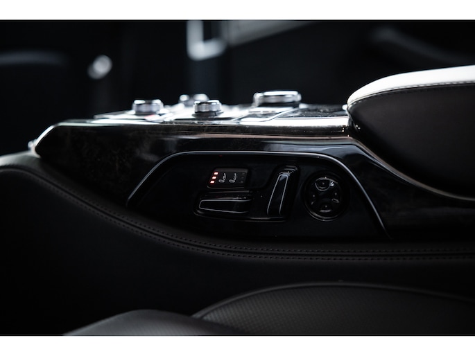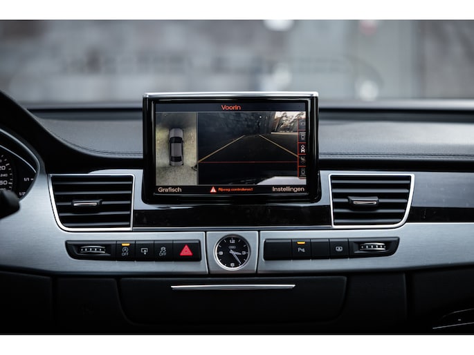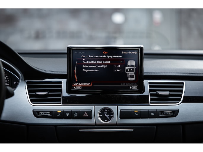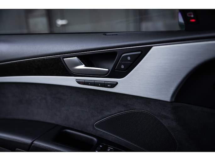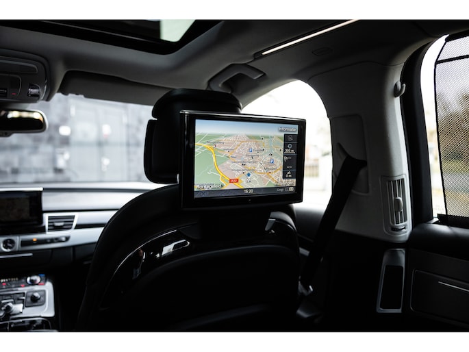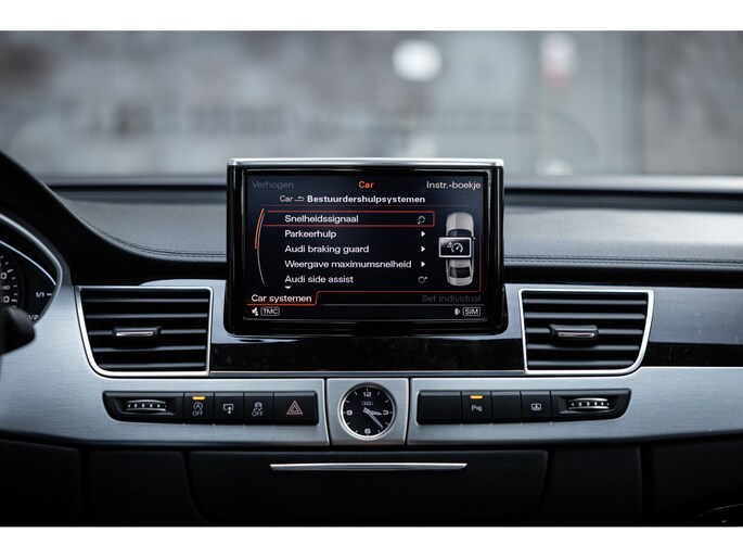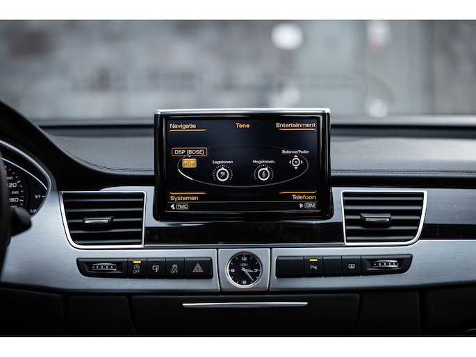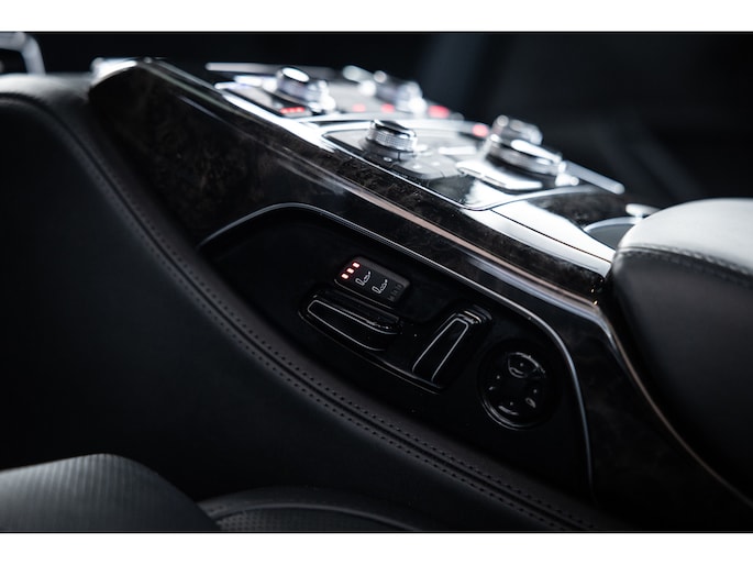 Meest in het oog springend is uiteraard het feit dat dit een A8 met verlengde wielbasis is – de zogenaamde ‘Lang’. De extra ruimte komt volledig voor de achter passagiers. Specifiek deze A8 is voorzien van de enkele stoel opstelling. Een unieke optie waarbij er slechts twee zitplekken achter zijn met een ultra luxe middenconsole en alle opties die je kunt wensen. Zo beschik je als passagier op één van deze zetels over volledig elektrisch bediende stoelverstelling, inclusief memorystanden, stoelverwarming, stoelventilatie en zelfs massage met verschillende programma’s. Vanaf de middenconsole of met de afstandsbediening bedien je het rear seat entertainment. De twee grote schermen tonen alle functies die voorin ook mogelijk zijn met als extra de mogelijkheid tot het kijken van video’s. Tevens voorziet de middenconsole van een opklaptafel en is er geopteerd voor maximale afwerking in leder en luxe hoogglans sierlijsten. Echt op het hoogste niveau.