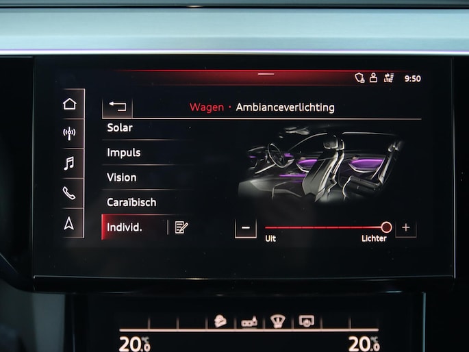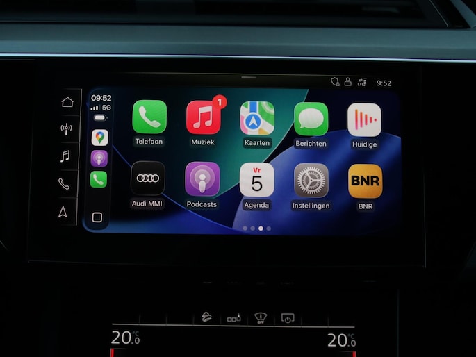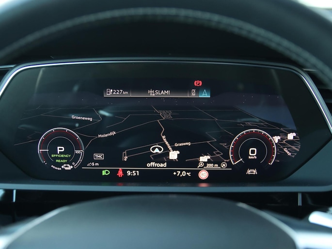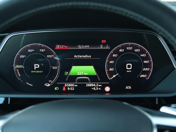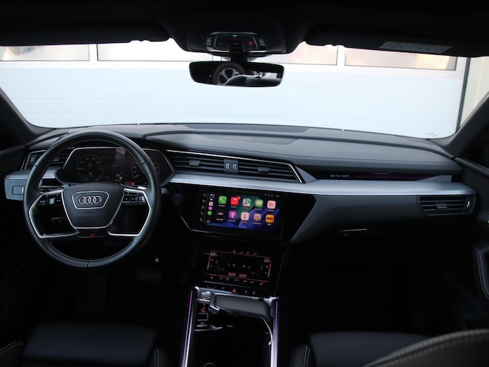 Duurzaam en dynamisch, de Audi e-tron verenigt deze twee uitersten in zich. Dit is een auto uit 2020, er staat 65842 kilometer op de teller. De voordelen van de elektromotor spreken voor zich: stil, schoon en snel! Fan van S-Line styling? Dat komt mooi uit, want deze is lekker sportief uitgevoerd. Luchtvering zorgt voor een onovertroffen comfort tijdens het rijden. Van binnen ziet u een lederen interieur, een stijlvolle uitvoering. Deze Audi e-tron legt bestuurder én bijrijder compleet in de watten met de verwarmbare voorstoelen. De sportstoelen houden u en uw bijrijder goed op z'n plek tijdens het accelereren en bij het nemen van scherpe bochten. Het elektrisch bediende panoramadak zorgt voor maximale lichtinval en frisse lucht in het interieur. De achterklep opent automatisch met een druk op de knop. Handig als u met volle handen staat. Tot de voorzieningen van deze auto behoren 22 inch lichtmetalen velgen, LED koplampen, adaptief dempingsysteem, warmtewerend glas, in delen neerklapbare achterbank en LED-achterlichten.