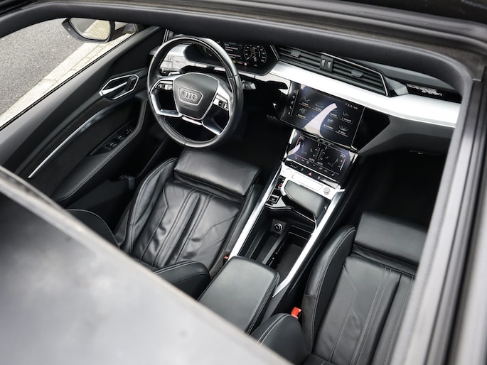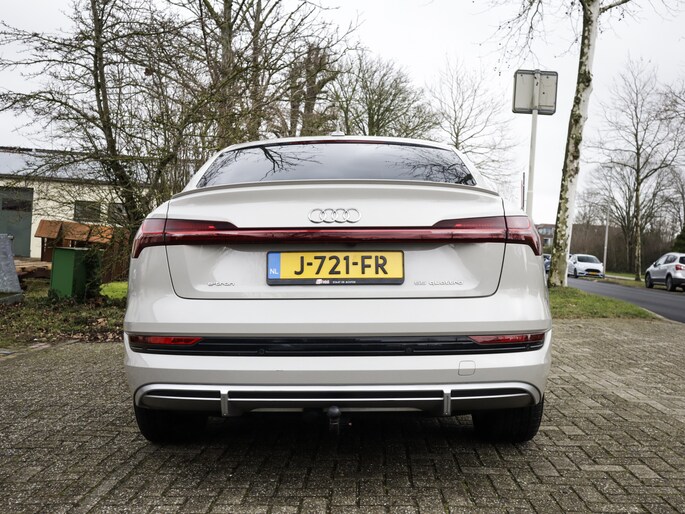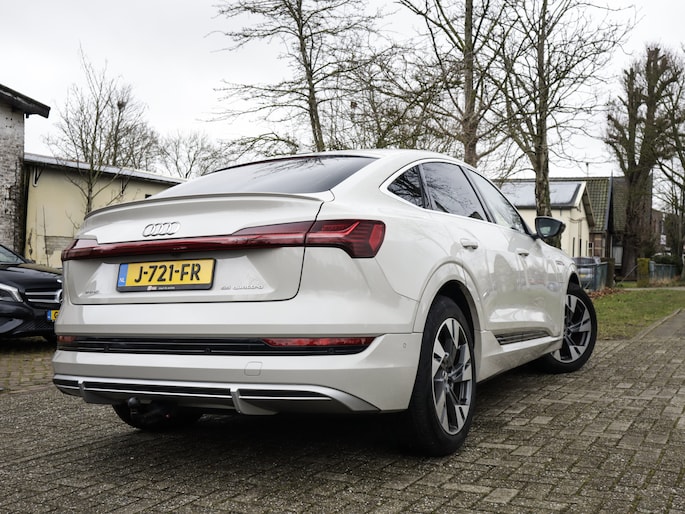 U voelt de onbeperkte kracht van elektrische aandrijving, elke keer als u op weg gaat met deze Audi e-tron Sportback. De voordelen van de elektromotor spreken voor zich: stil, schoon en snel! Exclusiviteit en sportiviteit komen samen in de S-Line styling. Een krachtige motor geeft deze auto zijn sportieve prestaties. Een eyecatcher is het lederen interieur. Maar onderschat ook het voordeel van een aantal 'kleine' details niet, zoals het elektrisch bediende glazen panorama dak en de elektrisch bedienbare achterklep. Een koude start op frisse dagen? Niet met de behaaglijke stoelverwarming. Op ieder wegdek een rimpelloze wegligging: dat is het voordeel van luchtvering. Ook achterin heerst een luxe sfeer, vanwege de verwarmde achterbank. Ook 20 inch lichtmetalen velgen, LED koplampen, adaptief dempingsysteem, warmtewerend glas, LED-achterlichten en verstelbare lendensteunen zijn aan boord.