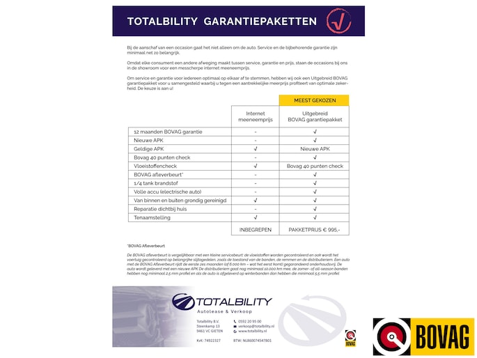 De internet meeneemprijs is inclusief 12 maanden wettelijke garantie, geldige APK, van binnen en buiten grondig gereinigd, tenaamstelling en een vloeistoffencheck. Optioneel biedt Totalbility een uitgebreid BOVAG pakket aan met de volgende aanvullingen t.o.v het standaard pakket: + 12 maanden BOVAG garantie, + BOVAG 40 punten check, + BOVAG afleverbeurt, + reparatie van je auto dichtbij huis, + 1/4 tank brandstof of volle accu (electrische auto), + nieuwe APK. (uitgezonderd youngtimers en oldtimers)