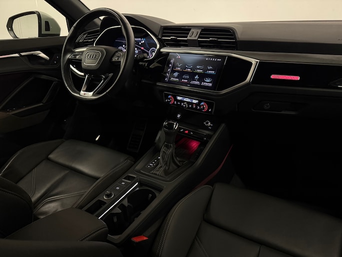 Bij het ontwerpen van de Audi Q3 Sportback stonden uw comfort en uw veiligheid centraal. De uitgesproken S-Line styling voegt een reeks sportieve accenten aan de vormgeving toe. De aandrijving van deze Audi wordt verzorgd door een viercilinder motor en een automatische transmissie. Zon en frisse lucht krijgen vrij spel dankzij het elektrisch bediende glazen panorama dak; de elektrisch bedienbare achterklep maakt het u gemakkelijk en u voelt zich omgeven door luxe van het lederen interieur! De stoelen zijn verwarmd en bieden ook in winterse kou een comfortabele zit. De koplampen zijn voorzien van de allernieuwste lichttechnologie: matrix LED-verlichting. In deze Audi profiteert u onder andere ook van: 20 inch lichtmetalen velgen, sportonderstel, warmtewerend glas, in delen neerklapbare achterbank, LED-achterlichten en variabele stuurbekrachtiging.