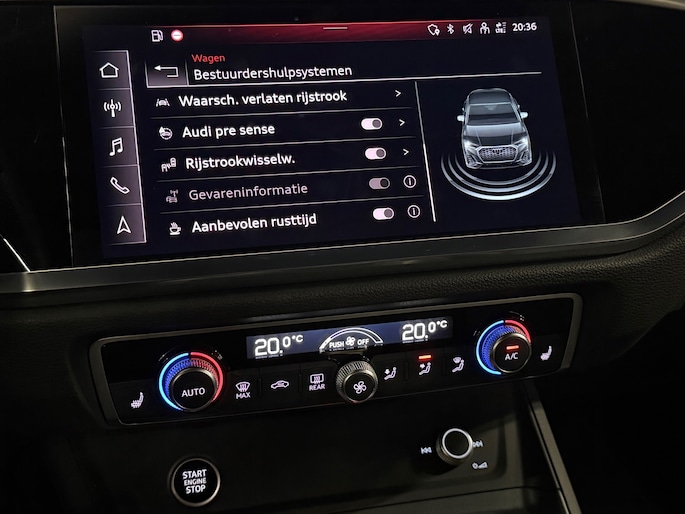 U geniet nog meer van het rijden met uw Audi omdat u wordt beschermd door intelligente veiligheidssystemen. In het instrumentarium kunt u bovendien de verkeersborden zien die u onderweg tegenkomt. Zo helpt deze Audi u om veiliger te rijden. Indien u onbedoeld de rijstrook lijkt te verlaten, reageert het Lane-keeping systeem meteen en corrigeert. Mindert een voorligger onverwachts te veel vaart, dan komt de forward collision warning in actie en waarschuwt meteen. In deze Audi vinden we verder een dodehoekdetectie, accident avoidance system, hill hold functie, frontale botsbescherming en bandenspanningcontrolesysteem.