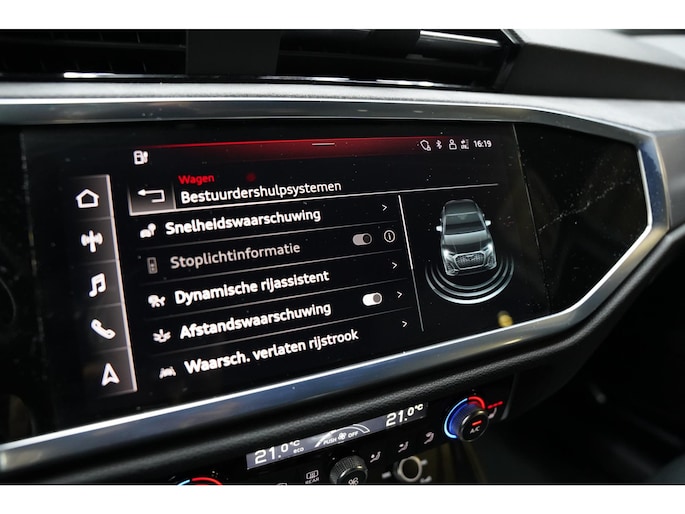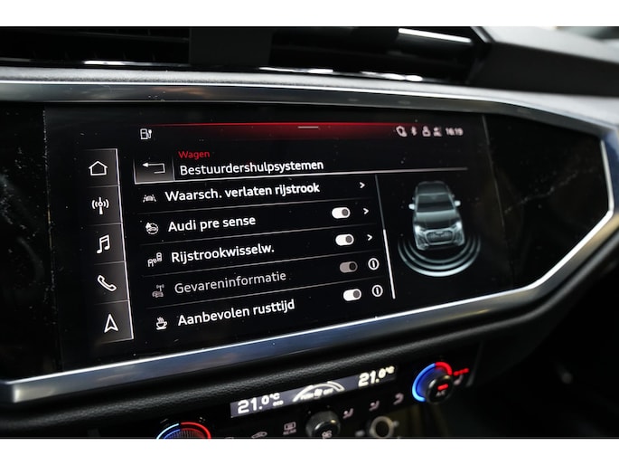 In de Audi Q3 Sportback heeft uw veiligheid en die van uw omgeving prioriteit. In het instrumentarium laat de verkeersborddetectie de actuele verkeersborden zien. Het Lane-keeping systeem let constant op en waarschuwt of corrigeert als u onoplettend over de lijnen van de rijstrook gaat. De actieve dodehoekdetectie minimaliseert het gevaar van ongelukken wanneer u afslaat of inhaalt. Verder is deze auto uitgerust met accident avoidance system, forward collision warning system, hill hold functie, brake assist, vermoeidheidsherkenning en bandenspanningcontrolesysteem.