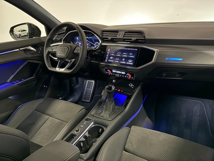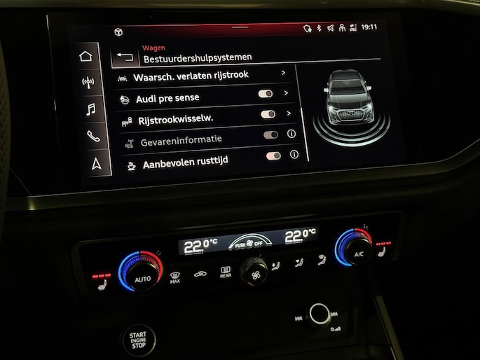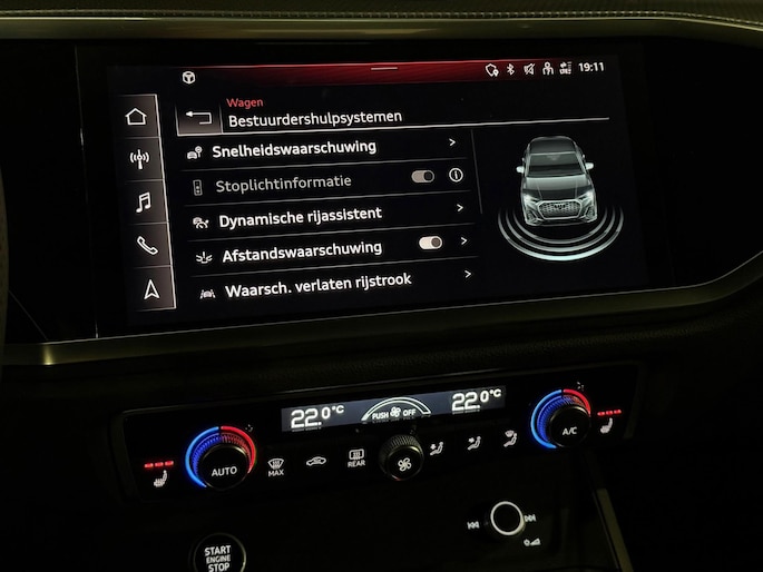 Pragmatisch en veilig als deze auto is, beschikt hij over diverse veiligheidssystemen. De actuele snelheidslimiet, een inhaalverbod en andere verkeersborden; de verkeersborddetectie ondersteunt u tijdens elke rit. Onbedoeld buiten de rijstrook raken wordt voorkomen door het Lane-keeping systeem. Deze Audi Q3 Sportback blijft altijd alert. Zo wordt gebruik gemaakt van forward collision warning. Bij het mogelijke risico op een aanrijding met een voertuig voor u, slaat het systeem alarm. Met voorzieningen als dodehoekdetectie, accident avoidance system, hill hold functie, frontale botsbescherming en bandenspanningcontrolesysteem, bent u altijd veilig onderweg.