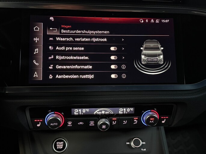 De nieuwste veiligheidssystemen komen in deze Audi Q3 Sportback samen. Een belangrijke bijdrage aan de veiligheid onderweg levert de verkeersbord-detectie. Het Lane-keeping systeem doet precies wat nodig is: waarschuwen en corrigeren bij onbedoelde overschrijding van de rijstrooklijnen. De forward collision warning reduceert het gevaar van een botsing met een voorligger significant. In deze Audi vinden we verder een dodehoekdetectie, accident avoidance system, hill hold functie, frontale botsbescherming en bandenspanningcontrolesysteem.