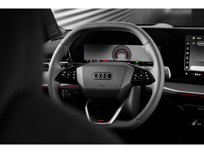 - Chroomkleurige stuurapplicatie, S-logo, geperforeerd leder ter hoogte van de handen, contraststiksels