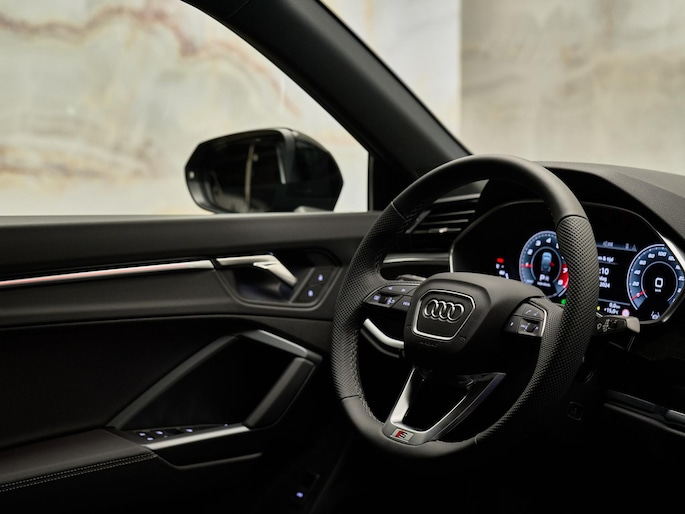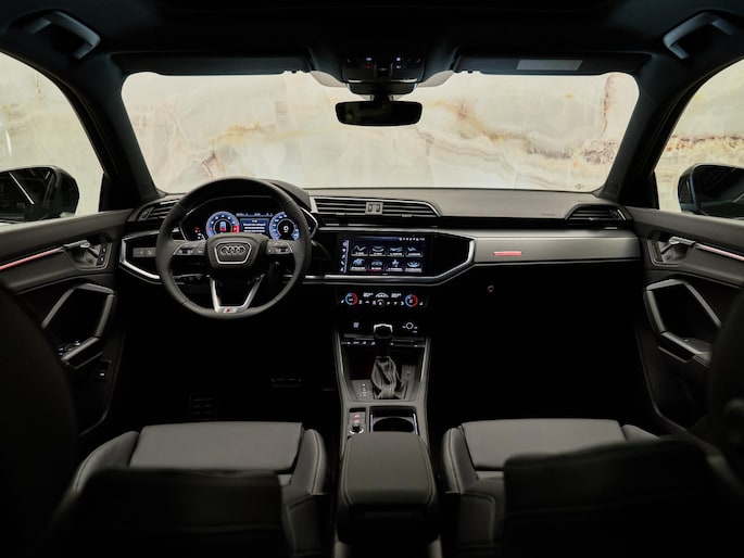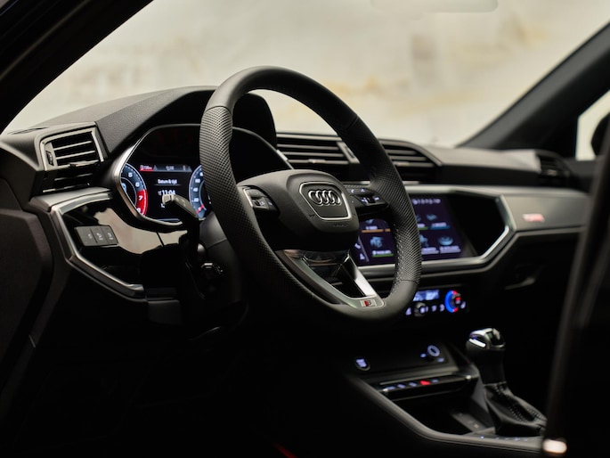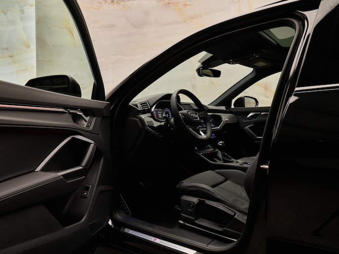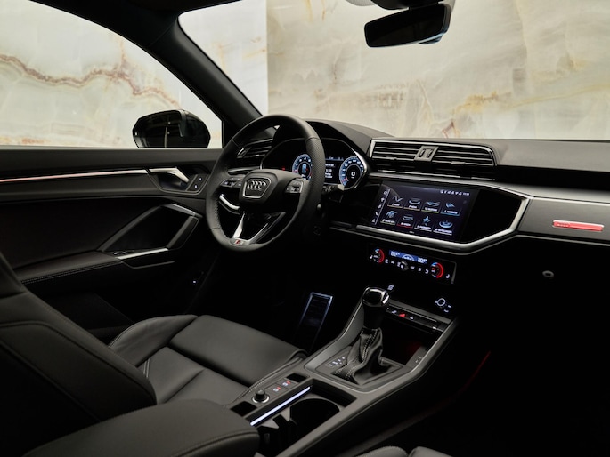 Het interieur van de Audi Q3 Sportback is een perfecte combinatie van luxe en comfort. De voorstoelen zijn uitgevoerd in leder en mono.pur 550-kunstleder met S-logo's (N4M) en bieden extra steun dankzij de 4-voudig instelbare lendensteunen (7P1). Voor de bestuurder en voorpassagier is er stoelverwarming (4A3) aanwezig, en het glazen panoramadak (3FB) zorgt voor een ruimtelijk gevoel in het interieur. De automatische airconditioning met twee zones (9AK) zorgt voor een comfortabele temperatuurregeling voor beide inzittenden.