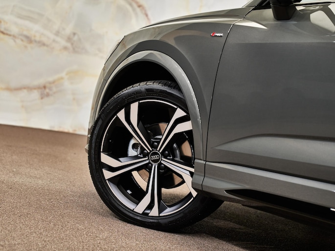Het sportieve karakter van deze Audi wordt versterkt door het optiekpakket zwart plus en de S line-bumpers in carrosseriekleur (2JD), die de auto een elegante en dynamische uitstraling geven. De 20-inch Audi Sport 5-dubbelspaak-rotor velgen (42F) dragen verder bij aan het imposante uiterlijk. Het privacy glas (QL5) achter geeft de auto een extra exclusieve look. De LED-koplampen met dynamische knipperlichten achter (PX2) zorgen voor een moderne en veilige verlichting.