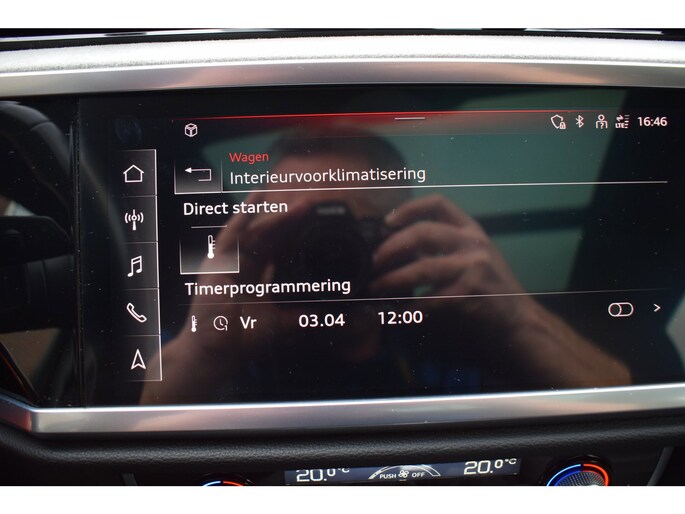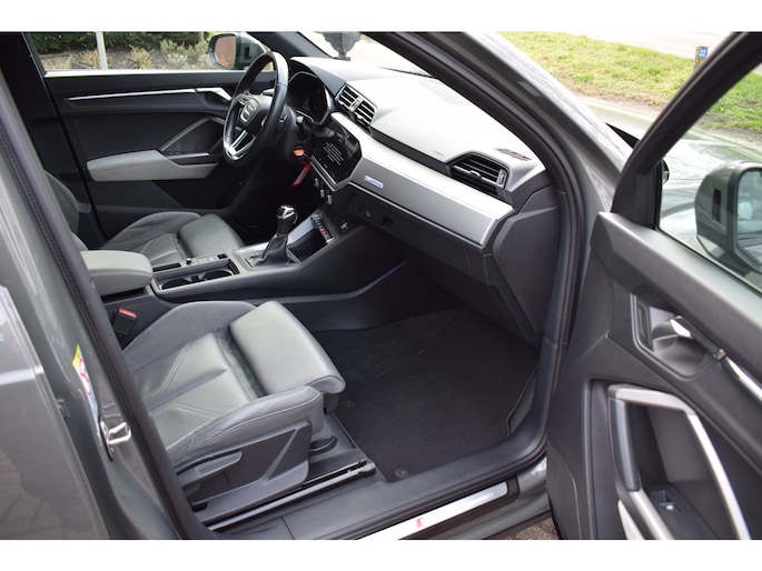 Alle ritinformatie en communicatie is gebundeld in één overzichtelijk digitale dashboard. Elk van de vier camera's op deze auto draagt bij aan het creëren van een onbelemmerd uitzicht van 360 graden rondom de auto. Adaptive cruise control houdt de ingestelde snelheid vast en houdt automatisch afstand tot uw voorligger. Deze Audi Q3 45 TFSI e S-LINE edition is 'connected'. Belangrijke functies worden permanent gemeten en zijn uit te lezen via een speciale app, ook op afstand. Elke weg is een bekende weg voor het aanwezige navigatiesysteem met harde schijf. U bent in deze Audi ook voorzien van automatische airconditioning, sportstuur met schakelpaddels, DAB ontvangst, regensensor, keyless entry en buitentemperatuurmeter.