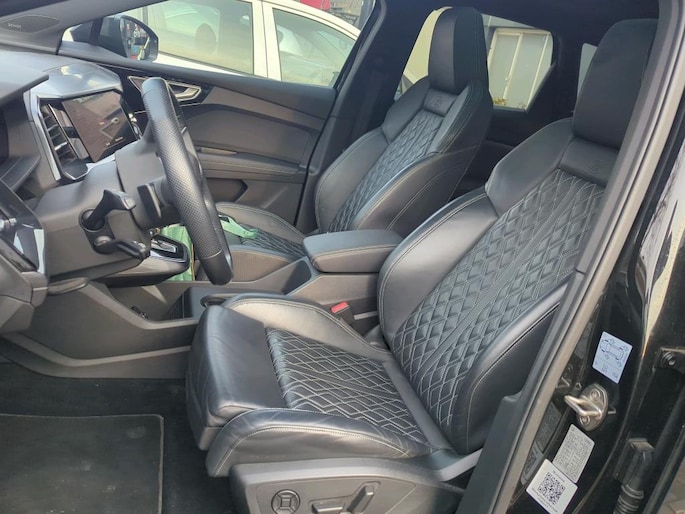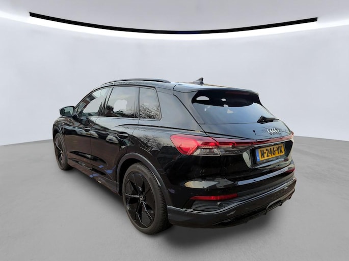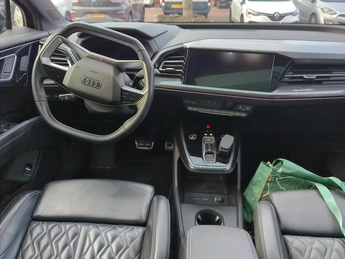 Kijk naar de onvergelijkbare vormgeving. De Audi Q4 e-tron is een elektrische auto die zijn bijzondere karakter niet voor de buitenwereld verbergt. De elektromotor is stil en schoon. En met een verrassend grote actieradius! Grijze muizen zijn er al genoeg. Daarom heeft deze auto een lekker pittige S-Line styling. De krachtige motor geeft deze Audi uitstekende prestaties. De luxe van het lederen interieur, gecombineerd met het gemak van het elektrisch bediende glazen panorama dak en de superhandige elektrisch bedienbare achterklep zorgen voor een wel heel complete uitvoering. Je zit er altijd warmpjes bij door de stoelverwarming. De koplampen met matrix LED-verlichting geven daglichtkwaliteit zonder tegenliggers te hinderen. Bij de uitrusting van deze auto horen onder meer 21 inch lichtmetalen velgen, sportonderstel, adaptief dempingsysteem, geluidsisolerende ramen, in delen neerklapbare achterbank en LED-achterlichten.