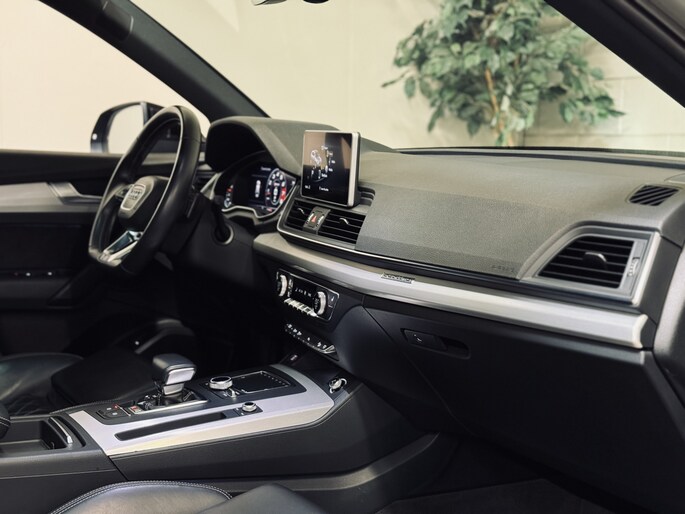 Hele fraaie Audi SQ5 in de populaire kleur Quantum Grey. Voorzien van de juiste opties, waaronder 21" lichtmetalen velgen, Valcona leder met ruitmotief, Bang & Olufsen audio, elektrisch glazen panoramadak, elektrisch verstelbare stoelen met geheugen, virtual cockpit, keyless entry/start, elektrische achterklep, stoelverwarming, etc. Recent voorzien van een Stage 1 Tuning op maat + testbank en DSG Tuning (rapport aanwezig). Momenteel een vermogen van bijna 400 PK en 670 Nm koppel. De auto wordt tevens geleverd inclusief Pirelli zomerbanden en Bridgestone winterbanden.
