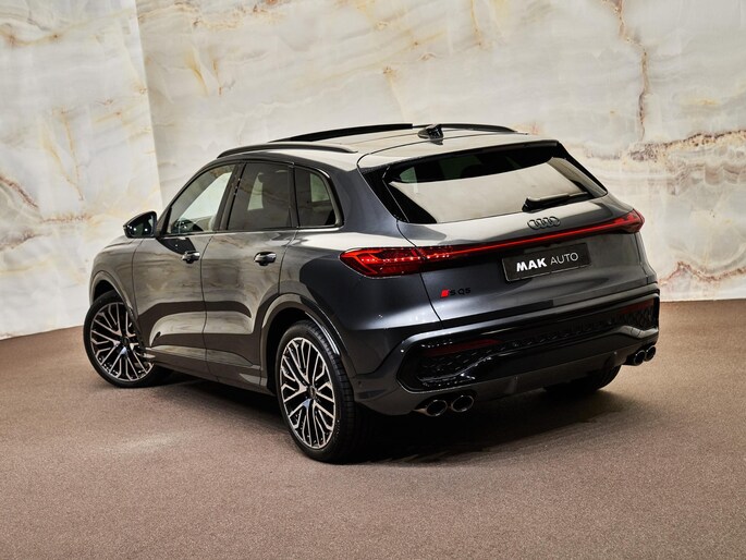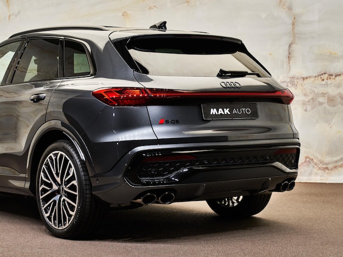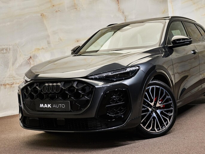 Deze SQ5 is uitgevoerd met het Optiekpakket zwart (PAH), Audi Sport 21 inch lichtmetalen velgen (53A), donker privacy glas achter (QL5) en rode remzadels (PC2). De hemelbekleding in zwart (6NQ) en het verlichtingspakket (QQ4) met sfeervolle LED-ambienteverlichting zorgen voor een bijzonder hoogwaardige uitstraling. De garageopener (VC2) maakt het plaatje af.