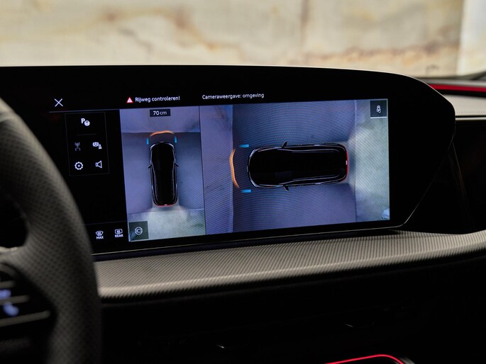 Het Head-up display (KS1) projecteert belangrijke rijinformatie direct op de voorruit in het gezichtsveld van de bestuurder. Met het Assistentiepakket Tour (99C) inclusief Adaptive cruise control met Stop & Go (8T3), active lane assist (6I5), uitwijkassistent (4G3) en verkeersbordherkenning (QR9) rijdt u veiliger en comfortabeler dan ooit. De parkeerassistent met afstandsbediening (FT1) in combinatie met het camerasysteem voor en achter (KA4) maakt parkeren en manoeuvreren eenvoudig en overzichtelijk.