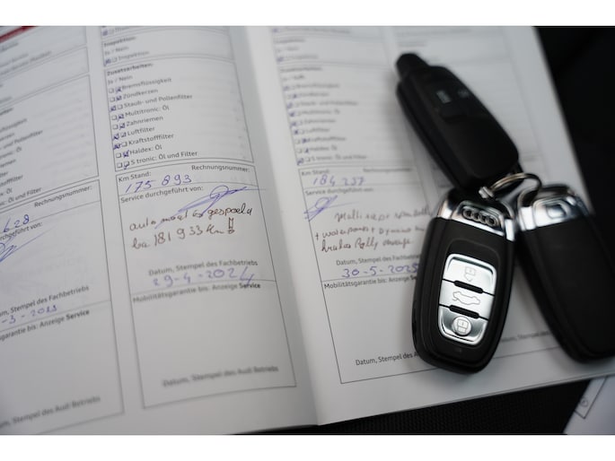 De Audi wordt met een nieuwe APK afgeleverd en de volgende onderhoudsbeurt is voor mei 2026.