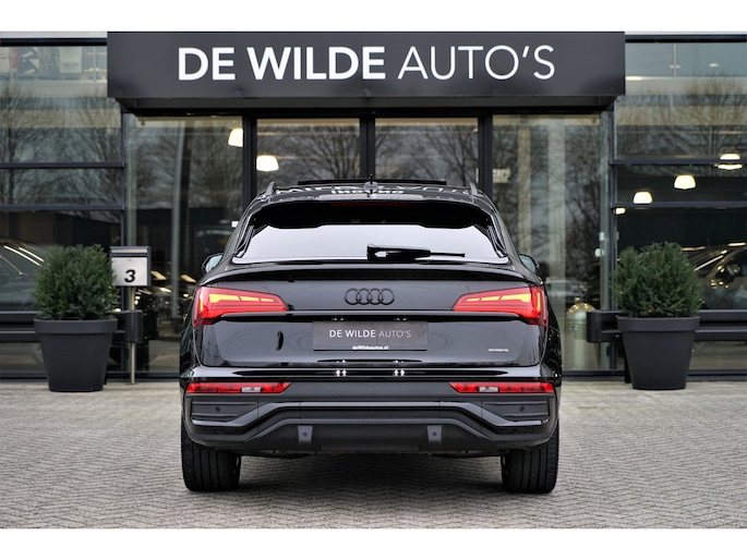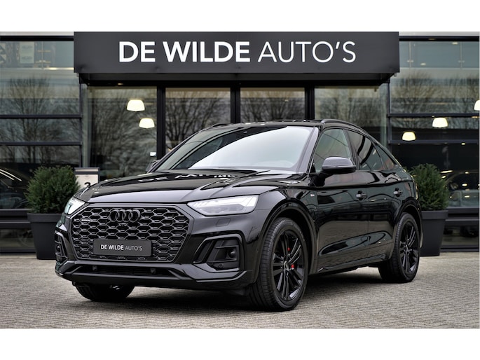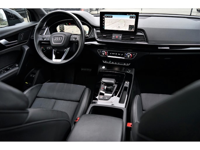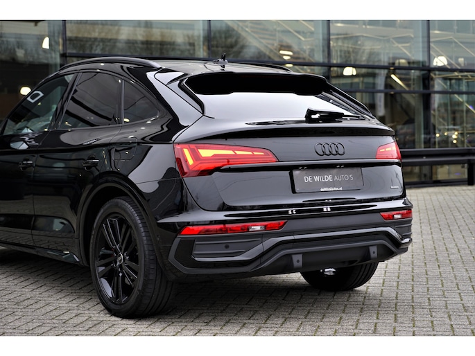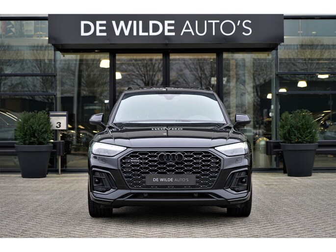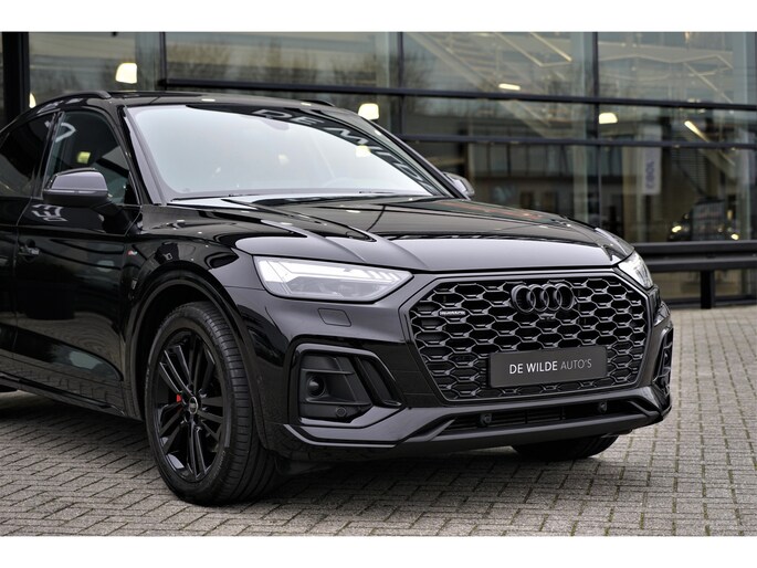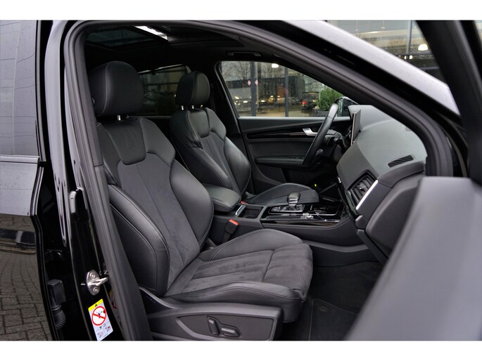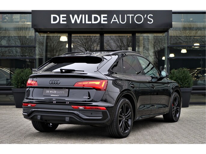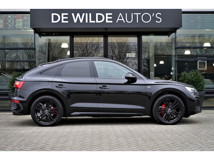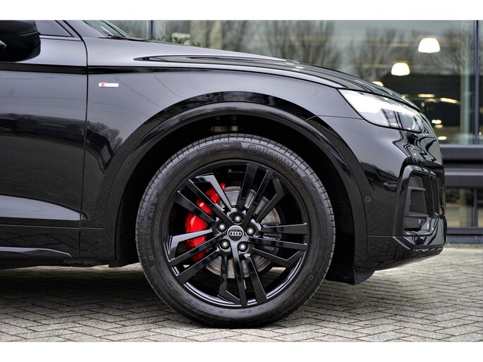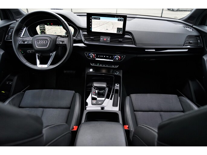 Facelift-versie Audi Q5 sportback Competition 55 TFSI e Quattro S-line in de kleur 'Mythoszwart metallic'. De auto is compleet Audi dealer onderhouden en heeft slechts één eigenaar gehad.
