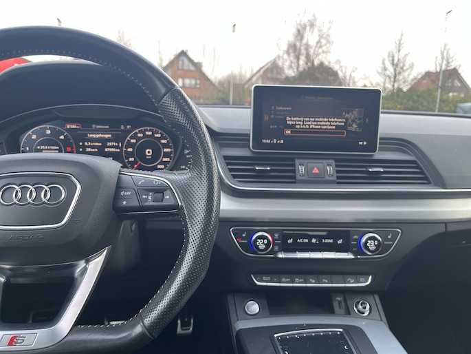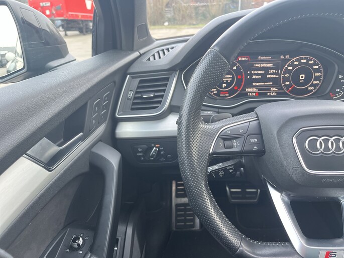 Deze Audi Q5 3.0 TDI quattro Sport Pro Line uit 2018 is zo’n auto waar je na elke rit met een glimlach uitstapt. Uitgevoerd in het stijlvolle Mythos Black Metallic straalt hij kracht, luxe en sportiviteit uit, precies zoals je van een Q5 mag verwachten. Het panoramadak zorgt voor een heerlijk lichte cabine, terwijl het interieur je direct omarmt met de prachtige S line stoelen met diamond stitch, voorzien van memoryfunctie en stoelverwarming. Het afgevlakte S line sportstuur ligt perfect in de hand en benadrukt het dynamische karakter van deze auto, zonder in te leveren op comfort.