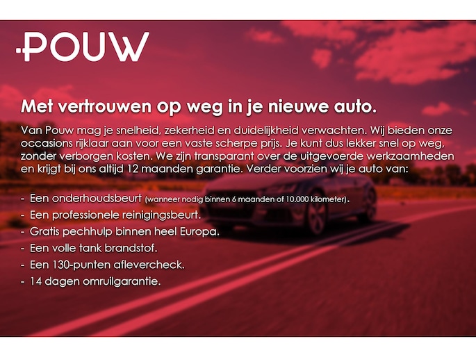 Wij hebben je auto op 130 technische punten gecontroleerd. Moet de onderhoudsbeurt plaatsvinden binnen 6 maanden of 10.000 kilometer (afhankelijk van wat het eerst komt)? Dan hebben wij die alvast uitgevoerd. De binnen- en buitenkant van de auto is professioneel gereinigd en de auto heeft een volle tank brandstof / accu. Bovendien voorzien wij je Audi van 12 maanden Pouw-garantie, inclusief gratis pechhulp binnen heel Europa. Laat je het jaarlijkse onderhoud en de geadviseerde reparaties volgens voorschrift uitvoeren, dan houd je het recht op deze mobiliteitsgarantie.
