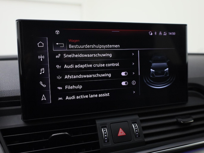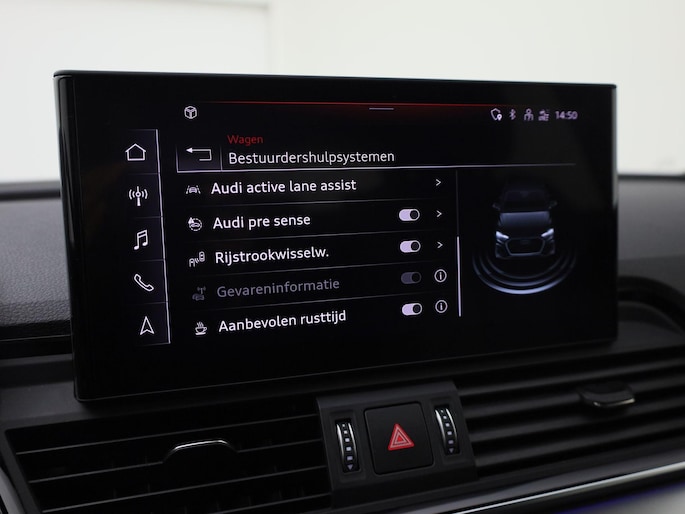 Pragmatisch en veilig als deze auto is, beschikt hij over diverse veiligheidssystemen. De camera van de verkeersborddetectie herkent verschillende soorten verkeersborden en toont deze op het dashboard. Voorzien van het Lane-keeping systeem. Ofwel: blijf automatisch in je baan. In een noodsituatie waarschuwt forward collision warning bij een dreigende aanrijding met een voorligger. In deze Audi vinden we verder een dodehoekdetectie, hill hold functie, brake assist en bandenspanningcontrolesysteem.