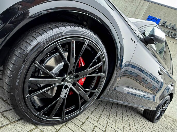 NIEUW MODEL | MODEL 2018| Ze worden steeds zeldzamer... Maar gelukkig zijn ze er ''mondjesmaat'' nog wel!! Een echte Audi SQ5 3.0 TFSI V6 QUATTRO 260kw/354pk 6-CILINDER S-Tronic Automaat!! Dit betreft een in werkelijk uitmuntende staat verkerende, origineel Audi dealer exemplaar. Welke afkomstig is van de 2e eigenaar met een zeer interessant gecontroleerde tellerstand van slechts 60.670 km. In unieke ofwel perfecte fabrieksconfiguratie; Mythos Black Pearl Metallic lak gecombineerd met het Zwart optiekpakket, het adaptieve instelbare comfortabele Audi Magnetic Ride/ Adaptieve dempingssysteem, de elektrisch verstelbare zwart Valcona lederen S kuipstoelen incl. Diamond Cross stitching met geheugen functie/ Memory, Audi Exclusive Alcantara airbag + lederen 3-spaaks Afgevlakte SQ5 Sportstuurwiel beide voorzien van Grijze stiksels icm de Carbon look interieur afwerking, Stoelverwarming voor- & achterzijde, Ambiance premium/ meerkleuren sfeerverlichting, Thermo-bekerhouder/ verwarmde & gekoelde bekerhouder, Black Edition, OEM elektrisch wegklapbare trekhaak fabrieksaf, HD Matrix Dynamische LED koplampen met 3D Dynamische knipperlichten voor- & achterzijde, Camera/ Rear View, B&O / Bang & Olufsen 3D Surround soundsysteem incl. Subwoofer, HUD/Head-up Display en natuurlijk mag het elektrische Panoramisch glazen schuif-/ kanteldak samen met de Audi Virtual Cockpit niet ontbreken! Deze SQ5 3.0TFSI V6 Quattro Competition biedt met de 260kw/ 354pk en 500Nm sterke 3.0 TFSI 6-Cilinder gekoppeld aan de Audi Quattro 4-wielaandrijving een trekvermogen van 2400kg, hoor je hem al...?! De getoonde 22inch Black Performance velgenset met 4x Hankook Ventus S1 EVO3 SUV zomerbanden is tegen geringe meerprijs van €2195,- te verkrijgen.