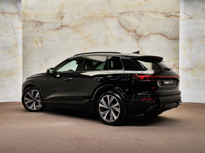Mythoszwart metallic (0E0E) lak in combinatie met het Zwart optiekpakket (PAH) en de 21” lichtmetalen velgen (46X) geeft de SQ6 e-tron een krachtige en sportieve uitstraling. De Privacybeglazing (QL5), Matrix LED-koplampen (PXC) en Digitale OLED-achterlichten (8VY) met dynamische animatie zorgen voor een opvallende lichtsignatuur. De Dakreling zwart (3S2) en de donkere Audi-ringen (4ZP) onderstrepen het sportieve karakter, terwijl het Panoramadak (3FU) het interieur vult met licht en ruimte.