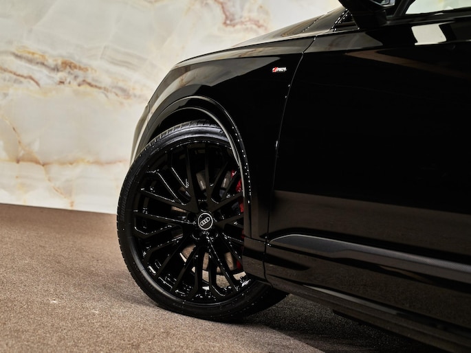 De uitstraling wordt bepaald door Mythoszwart metallic (0E0E), Optiekpakket zwart plus (4ZP) en Stylingpakket carbon (6FM). Binnenin: mat carbon twill decor (5MH), hemel in Dinamica (PL2), Leder Valcona met S-logo’s (N0Q) en Lichtpakket plus met ambient lighting (QQ2). Buitenspiegels 6XL zijn elektrisch inklapbaar, verwarmbaar, aan beide zijden automatisch dimmend en met geheugen. Velgen Audi Sport 22” (C9Y) met 285/35 R22 banden maken het plaatje af.