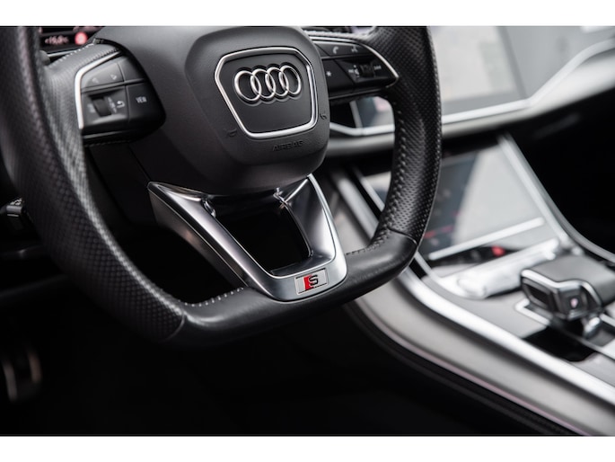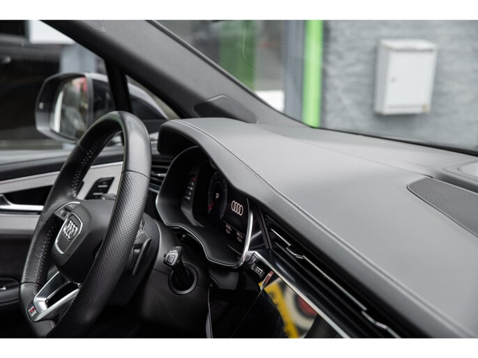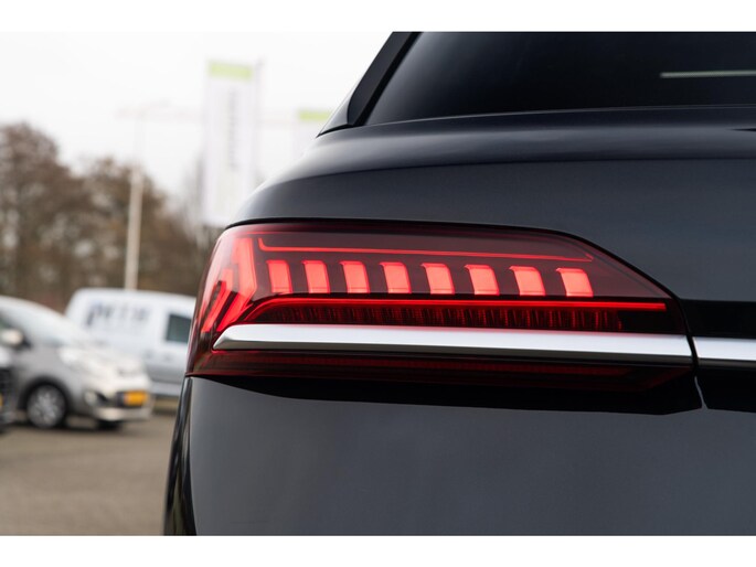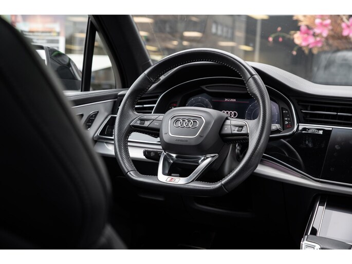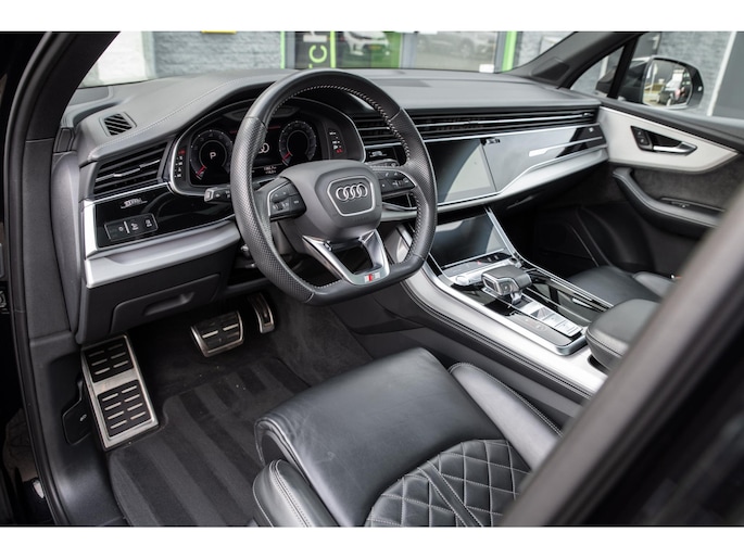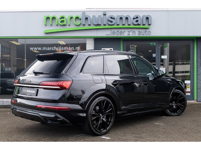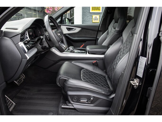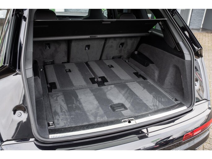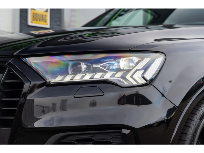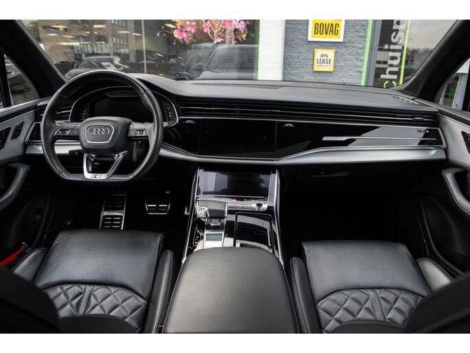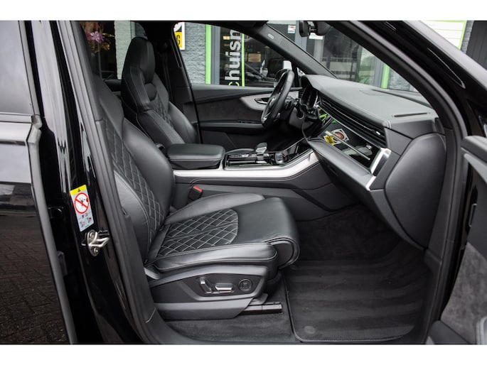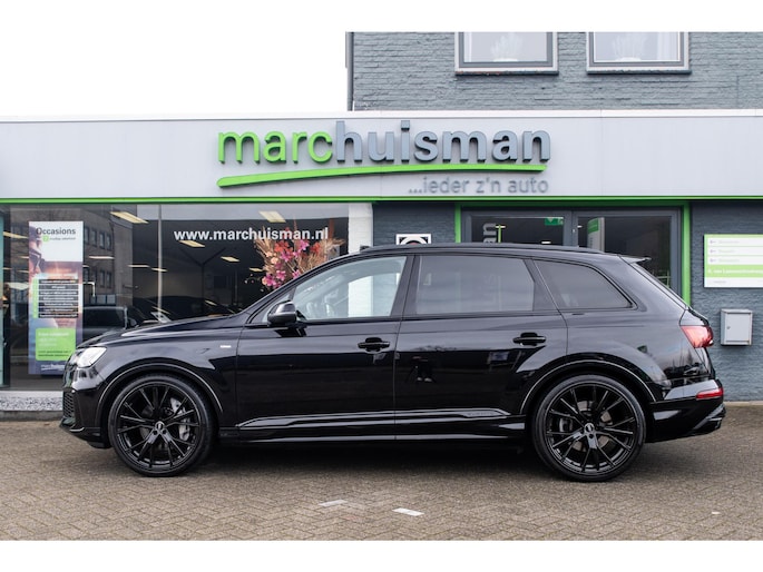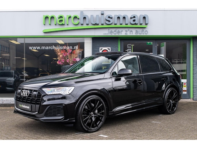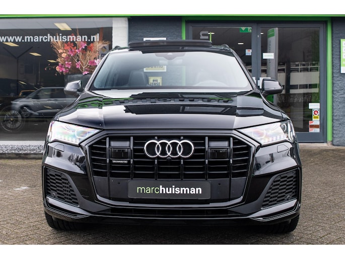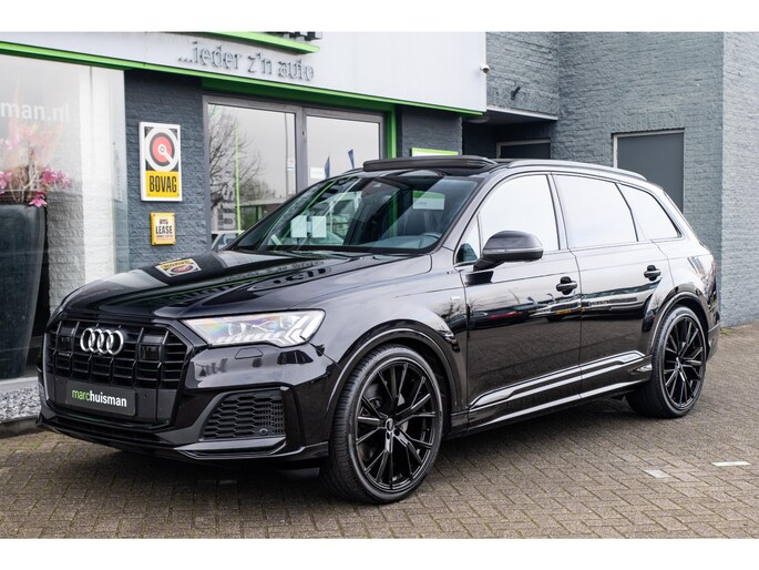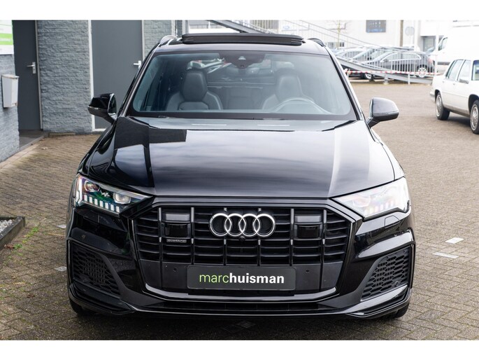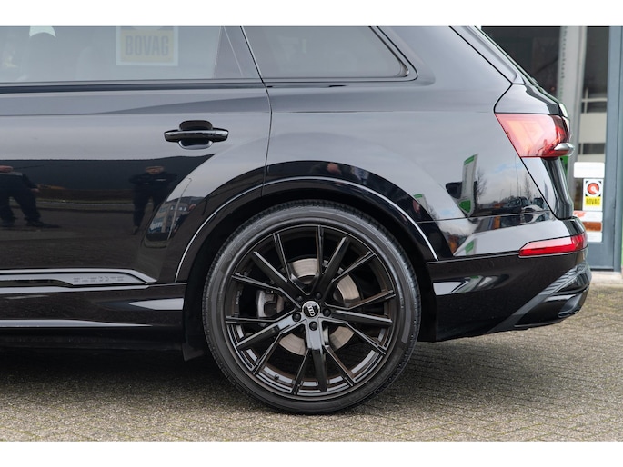 Prachtige Audi Q7 55 TFSI quattro geheel S-Line uitgevoerd en voorzien van 7 zitplaatsen. In Orcazwart metallic i.c.m. RS-stoelen met Valcona zwart lederen bekleding en ruitpatroon. Origineel Nederlands geleverd en volledig Audi dealer onderhouden. Uitgerust met veel (gewilde) opties zoals elektrisch bedienbaar glazen panoramadak, uitgebreid leder pakket (dashboard en deurpanelen), 22 inch SQ7 licht metalen velgen in glanzend zwart, stoelverwarming, Optiek pakket zwart, Audi Advanced Key (keyless entry), BOSE Soundsystem, servosluiting portieren, 4-wiel sturing, adaptieve cruise control, etc. Voorzien van veel fabrieksopties zoals: