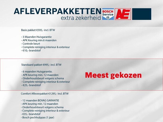 Dit afleverpakket bevat: BOVAG garantie (12 maanden); BOVAG 40-Puntencheck; BOVAG Afleverbeurt; 12 maanden BOVAG GARANTIE, APK keuring min. 12 maanden, Bosch pechhulppas (1 jaar), Complete reiniging interieur & exterieur, Onderhoudsbeurt volgens schema, €35,- brandstof