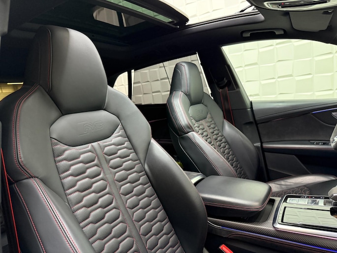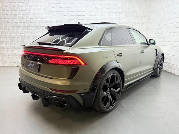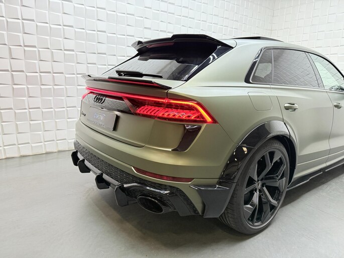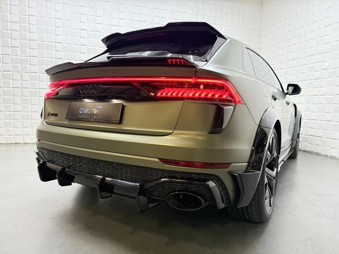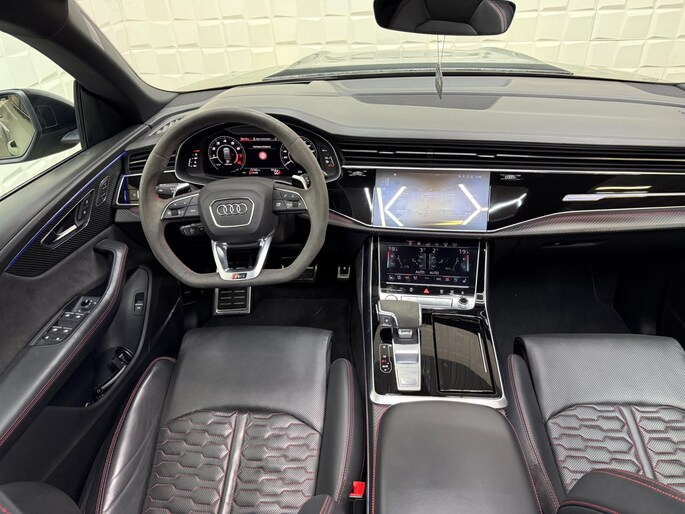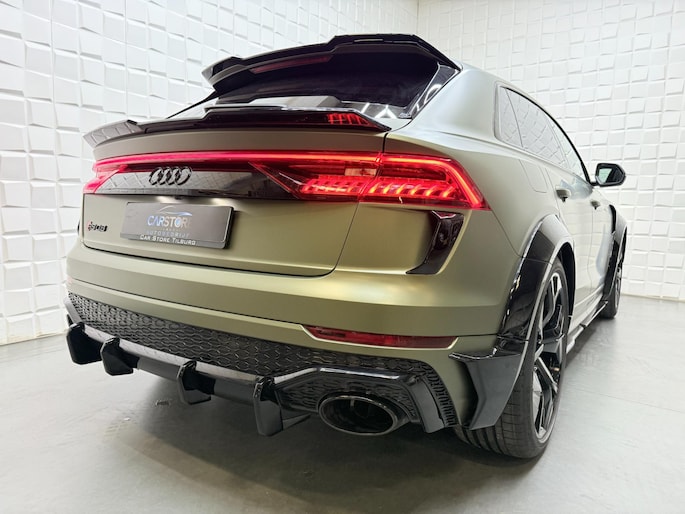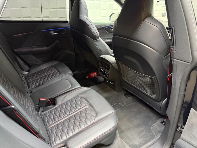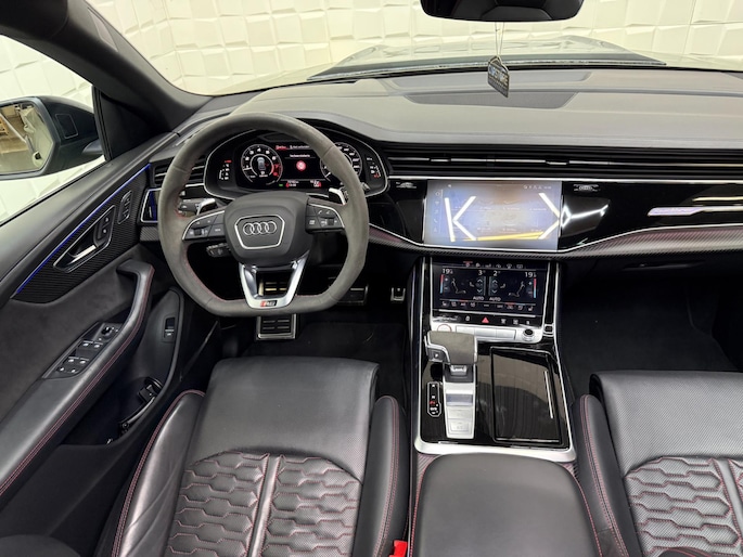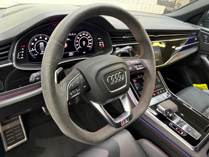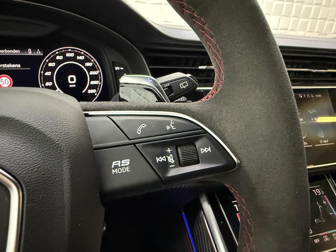 Met zijn compromisloze design, zijn geweldige vermogen en zijn uitgekiende techniek staat deze Audi RSQ8 garant voor sportieve topprestaties. Het sportieve uiterlijk is meegeleverd in de vorm van de S-Line styling. Met een achtcilinder motor en een automatische transmissie beschikt deze Audi over uitstekende prestaties. Ontdek de fantastische prestaties van vierwielaandrijving met deze 4x4! We nemen u in gedachten even mee. Stop uw bagage moeiteloos achterin dankzij de elektrisch bediende achterklep, neem plaats achter het stuur en zie meteen het luxe lederen interieur. Even het elektrisch bediende glazen panorama dak open en rijden maar! Dankzij de elektrische stoelbediening is het gemakkelijk om de optimale zitpositie te vinden. De achterbankverwarming, het verwarmbare stuurwiel en de verwarmbare voorstoelen brengen passagiers en bestuurder snel weer op temperatuur, ongeacht hoe koud het buiten is. Een mooie, constante en solide ligging op de weg: dat is het voordeel van luchtvering. De koplampen met matrix LED-verlichting geven daglichtkwaliteit zonder tegenliggers te hinderen. Natuurlijk behoren 22 inch lichtmetalen velgen, warmtewerend glas, trailer assistent, in delen neerklapbare achterbank, LED-achterlichten en verstelbare lendensteunen ook tot de uitrusting van deze complete auto.