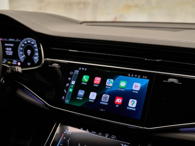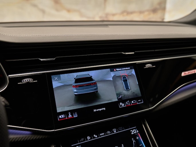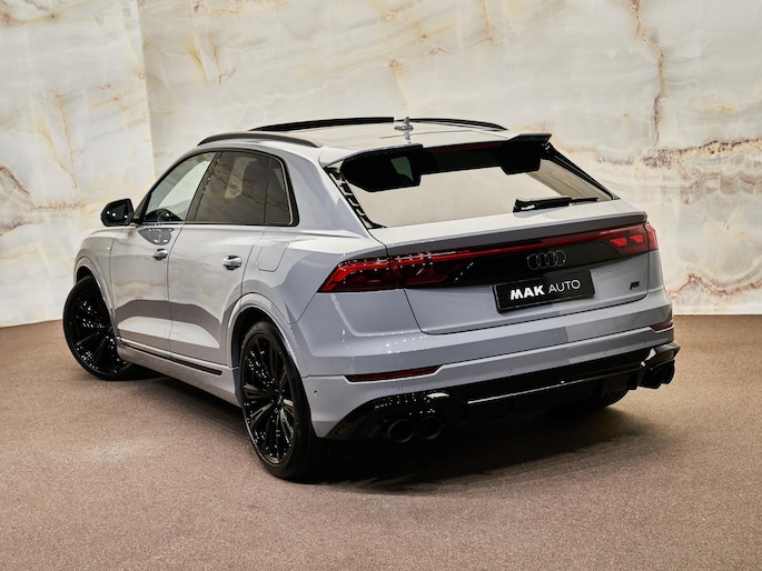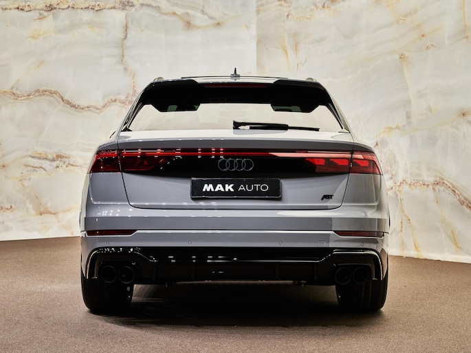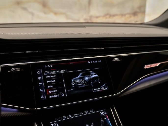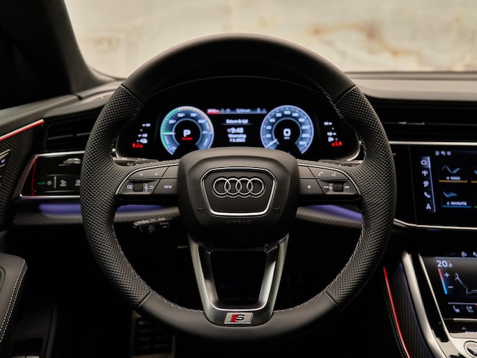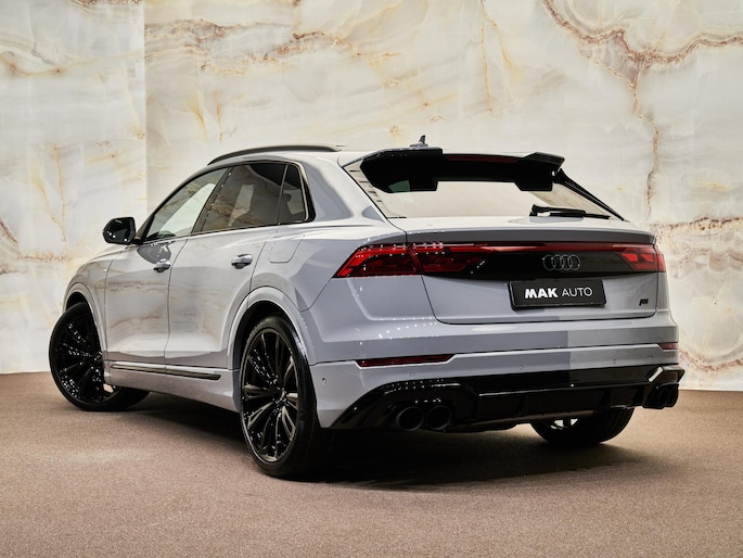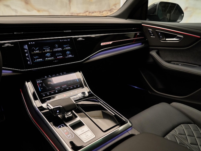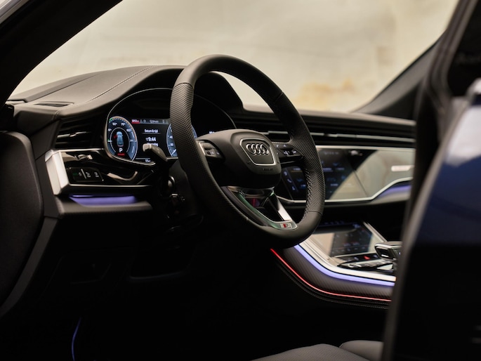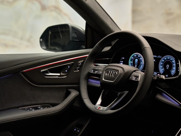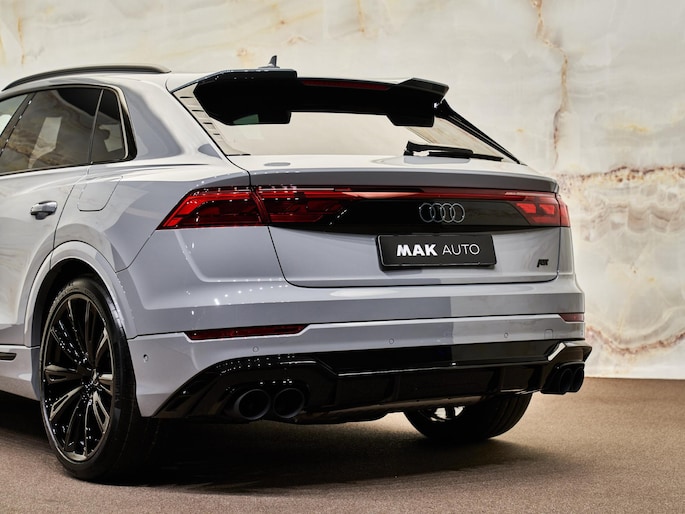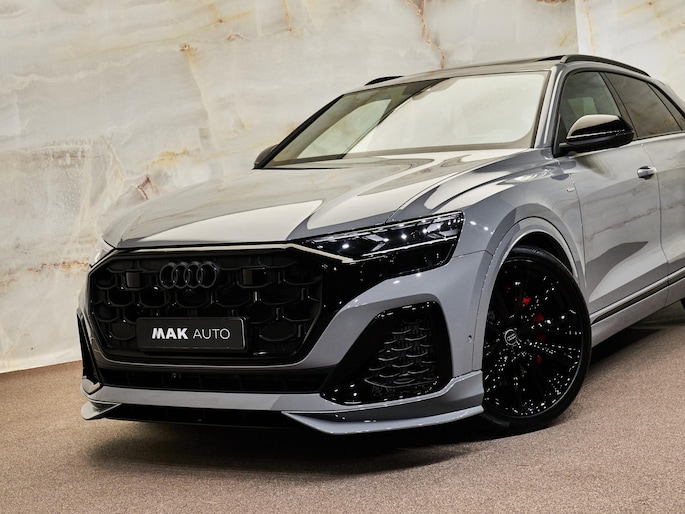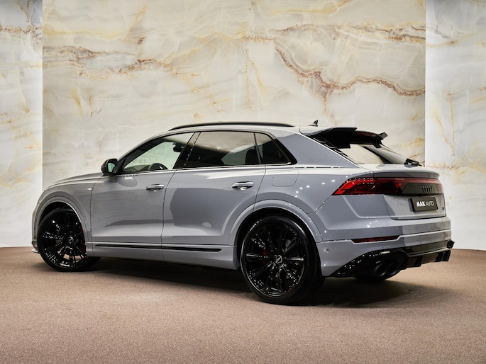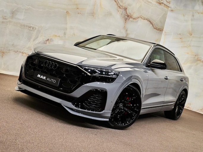 Het exterieur van de Audi Q8 straalt sportiviteit uit met zijn Nardogrijs (Audi Exclusive) (Q0Q0) kleur en zwarte buitenspiegelhuizen (6FJ). Binnenin zorgen de hoogwaardige lederen bekleding met S-logo's en ruitpatroon (N0Q) en de decoratieve mat carbon twill inlegstukken (5MH) voor een luxueuze ambiance.