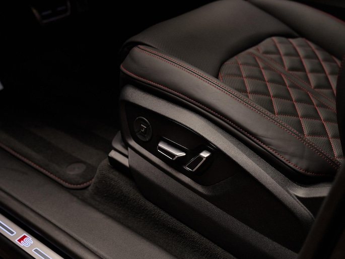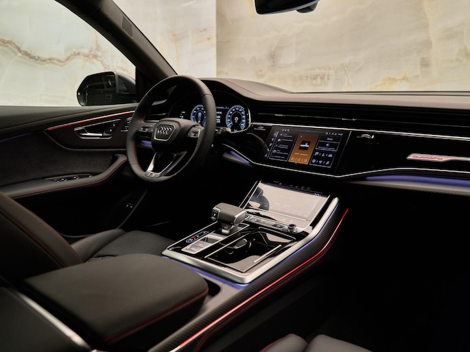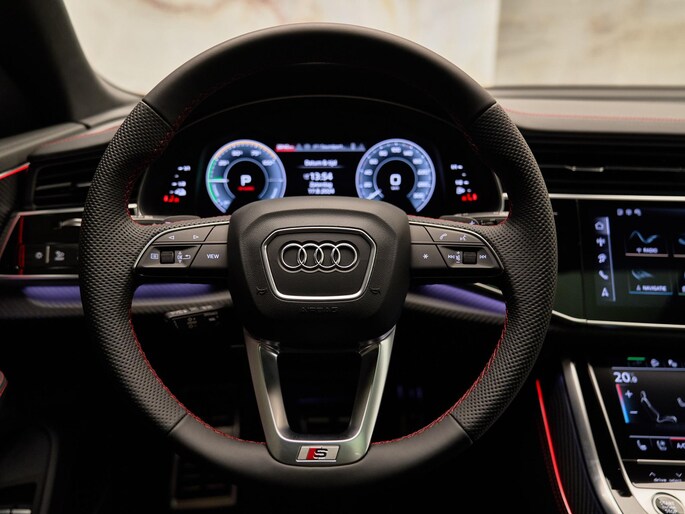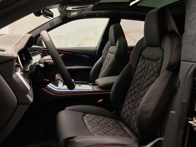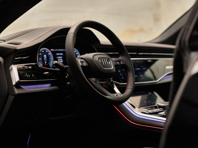 Het exterieur van de Audi Q8 straalt elegantie uit met zijn Mythoszwart Metallic lak (0E0E) en zwarte buitenspiegelhuizen (6FJ). Binnenin zorgen de hoogwaardige lederen bekleding met S-logo's en ruitpatroon (N0Q) en de decoratieve mat carbon twill inlegstukken (5MH) voor een luxueuze ambiance.