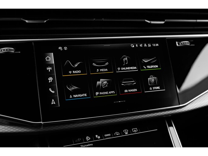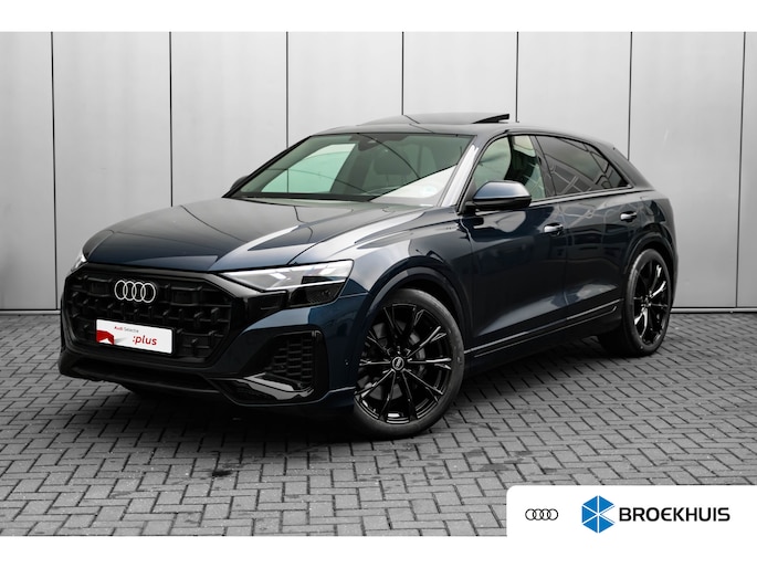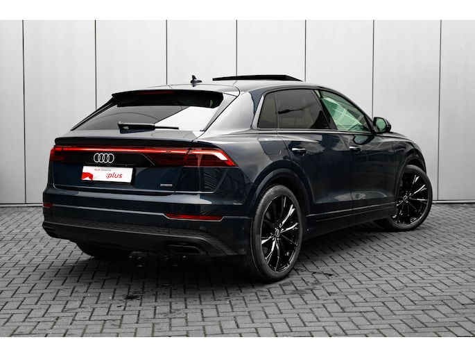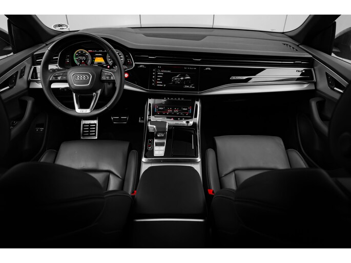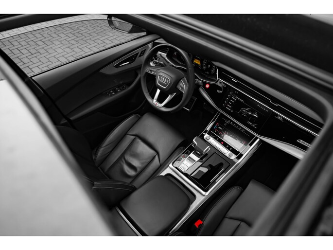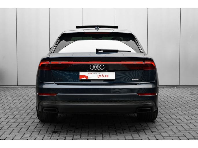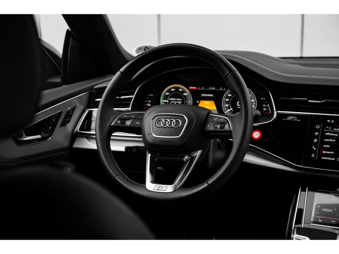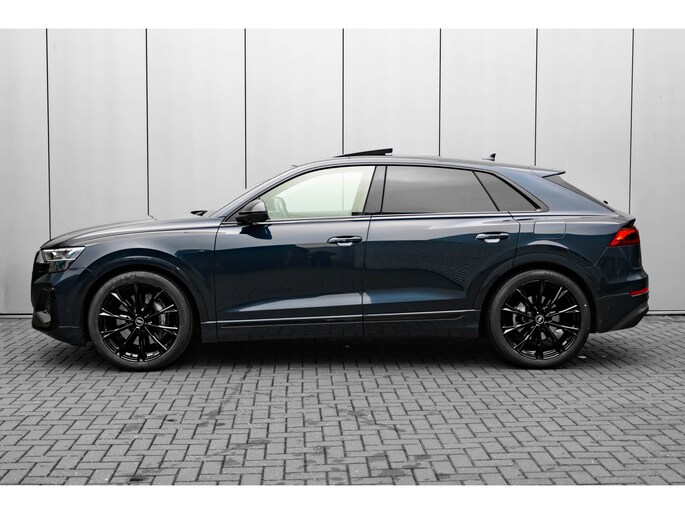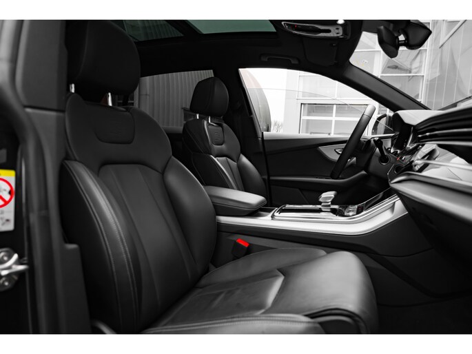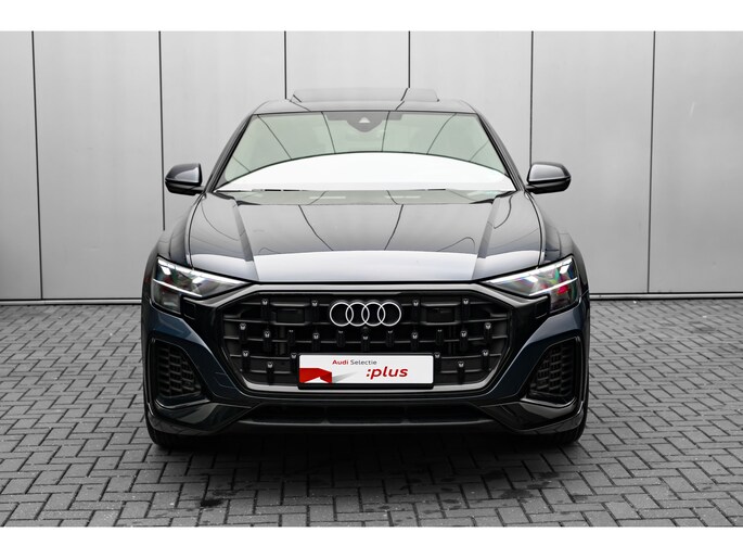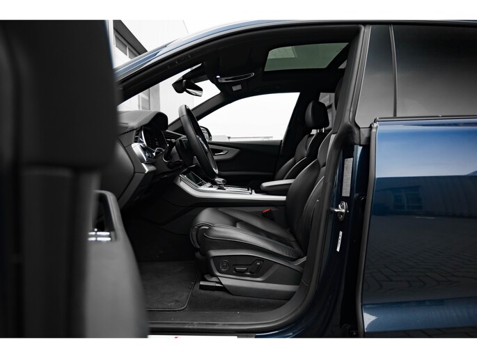 Alle technologie in de Audi Q8 is er op gericht om uw rit veilig en gemakkelijk te laten verlopen. De S-Line styling verfraait het uiterlijk met verschillende sportieve accenten. Een krachtige motor geeft deze auto zijn sportieve prestaties. Dat noemen ze nou een ruimtelijk effect: het elektrisch bediende glazen panorama dak, dat net zo gemakkelijk open en dicht gaat als de elektrisch bedienbare achterklep. En ondertussen het ware luxegevoel van het lederen interieur. U past de stoelen moeiteloos aan, ze zijn elektrisch in te stellen en hebben bovendien een geheugen. Met functies als stoelverwarming, verwarmbare achterbank en een verwarmbaar stuur, is comfort gegarandeerd in dit voertuig tijdens koude ritten. De verlichting van de koplampen geeft het gevoel dat het altijd dag is. De slimme matrix LED-technologie past zich aan bij tegenliggers, zonder verlies van lichtkwaliteit. Ook 21 inch lichtmetalen velgen, sportonderstel, adaptief dempingsysteem, warmtewerend glas, trailer assistent en dakspoiler zijn aan boord. Het digitale dashboard is qua lay-out en zichtbaarheid superslim ingedeeld. Alle functies in één keer in beeld! Het gebruik van de 360 graden camera op deze auto vergemakkelijkt het parkeren aanzienlijk, vooral in krappe ruimtes. Adaptive cruise control houdt de ingestelde snelheid vast en houdt afstand tot het voertuig voor u. Loopt het verkeer onderweg vast, schakel dan de file assistent in en laat het systeem zorgen voor de juiste afstand bij stilstaan en rijden. Veilig en comfortabel rijden wordt nog eens versterkt door Connected Services, zodat u diverse vitale functies van de auto altijd kunt checken in de app. U bent in deze Audi ook voorzien van full map navigatiesysteem, kruisend verkeer detectie, electronic climate control, draadloos opladen, DAB ontvangst en regensensor. Aan boord van deze Audi houden verschillende geavanceerde systemen voor u de weg in de gaten. Ze waarschuwen u voor noodsituaties en kunnen in een aantal gevallen ook zelf ingrijpen. Net als in een straaljager kunt u altijd vooruit blijven kijken. De head-up display zorgt dat uw ogen geen seconde hoeven af te dwalen en projecteert alle benodigde info op de voorruit.. Onderweg zorgt verkeersborddetectie ervoor dat u geen waarschuwingsbord mist. Het Lane-keeping systeem doet precies wat nodig is: waarschuwen en corrigeren bij onbedoelde overschrijding van de rijstrooklijnen. Dankzij veiligheidsvoorzieningen als dodehoekdetectie, forward collision warning system, hill hold functie en frontale botsbescherming, bent u steeds veilig onderweg. Deze sportwagen houdt van opschieten. U ook? Wacht dan niet langer en bel voor een afspraak!