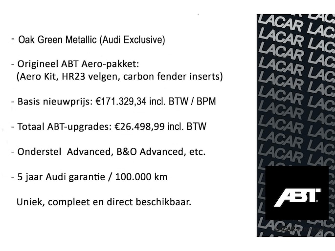 Audi Exclusive Oak Green Metallic ABT Aero Package, ABT HR23, Advanced Onderstel, Bang & Olufsen Advanced Sound System, Gar 5 jaar