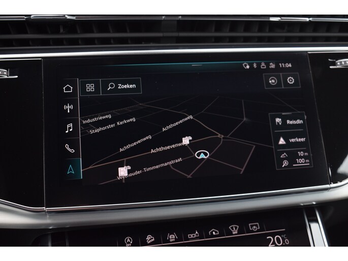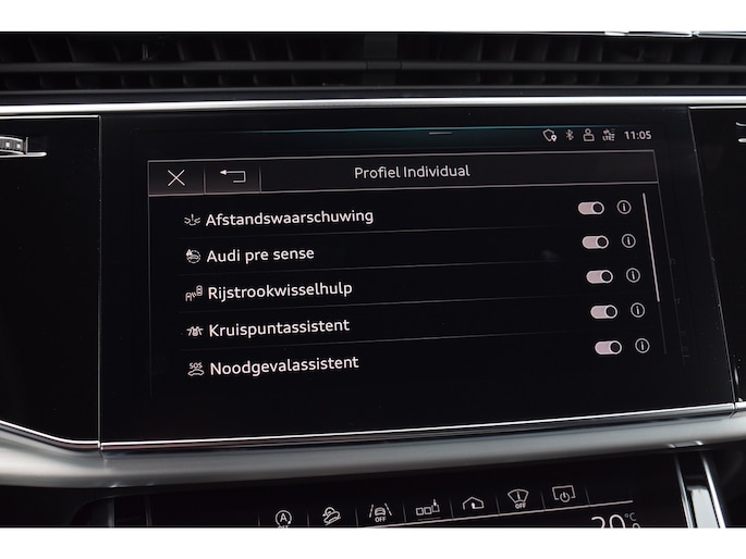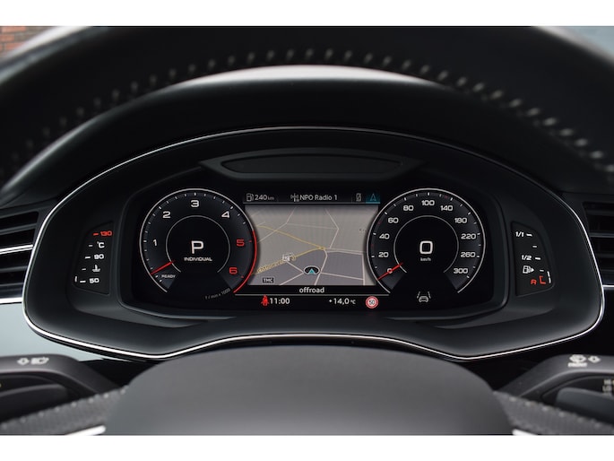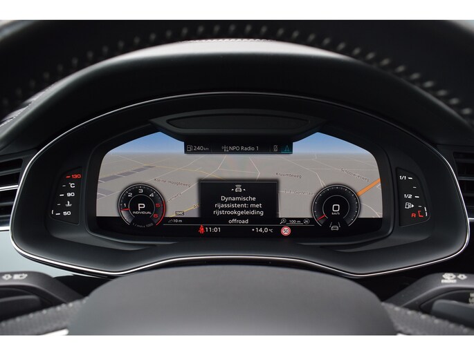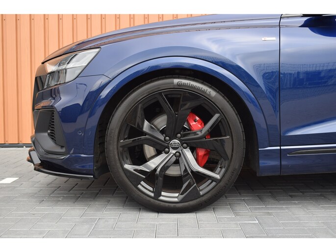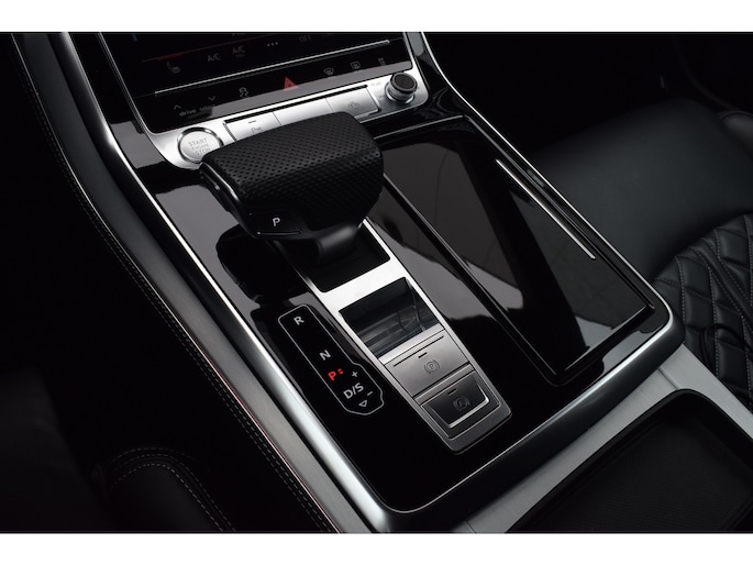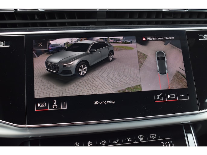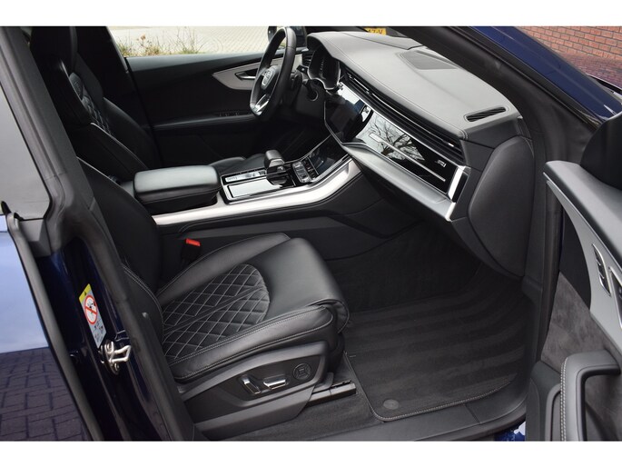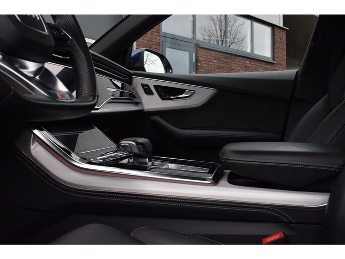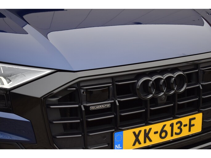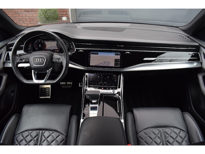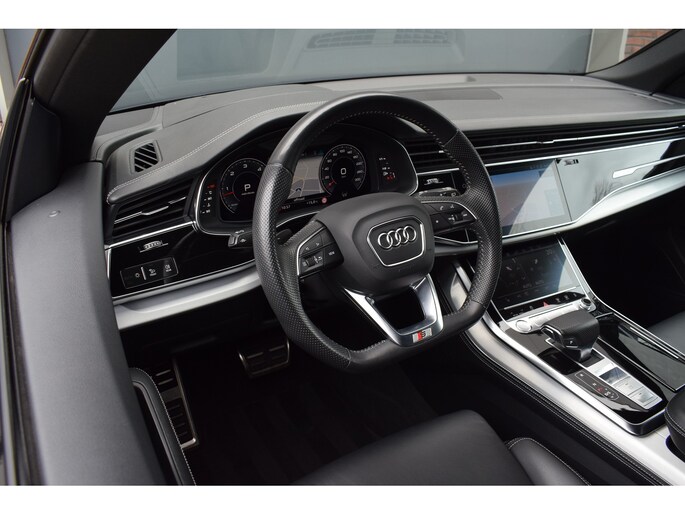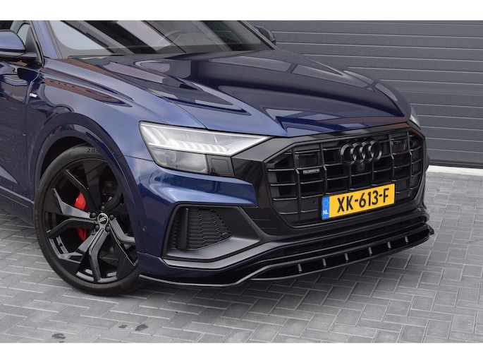 Audi Q8 50 TDI 286pk Quattro S-line. Compleet uitgevoerd met o.a.: Luchtvering, 4-wielbesturing, Panoramadak, Softclose, Navigatiesysteem 'High', APP Connect ( Apple Carplay / Android auto ), Head-Up display, Digitale radio ontvangst, Bang&Olufsen soundsysteem, Adaptieve Cruise Control, Lane Assist, File Assistent, Side Assist, Lederen interieur, Elektrisch verstelbare voorstoelen met geheugenfunctie, Sfeerverlichting, Stoelverwarming voor en achter, Climate control (voor en achter gescheiden regelbaar), Verwarmbare voorruit van isolerend glas, Matrix LED koplampen, LED achterlichten, Lichtmetalen velgen 23", Rode remzadels, Elektrisch bedienbare achterklep, Keyless entry, Interieurvoorverwarming met radiografische afstandsbediening, Top View 360° camera's incl. parkeerhulp vóór en achter met flankbescherming, Trekhaak met afneembare kogel.